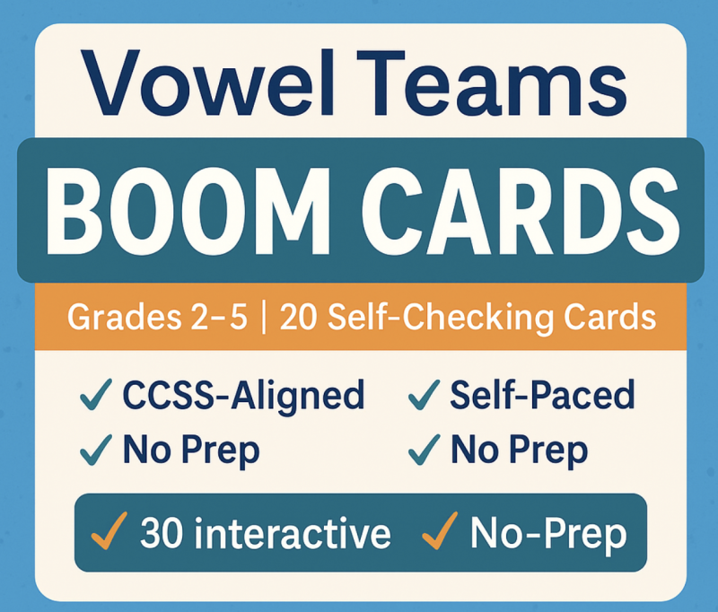 Engage your grades 2–5 students with this set of 20 self-checking, no-prep Boom Cards focused on mastering vowel teams. Perfect for self-paced learning, these interactive cards are CCSS-aligned and designed by a certified Newsela educator. Students get instant feedback as they work through each activity, building skills and confidence—while you save time on prep!
