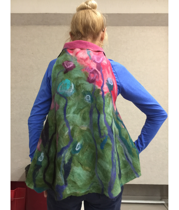 An Art Vest is the perfect transition for people who enjoy making scarves and shawls and desire to make garments. It is created flat, so you learn tips on just the right placement of sleeves and a few other things to make it wearable. As the name states, anything goes in design work. Participants should be able to stand for long periods of time.