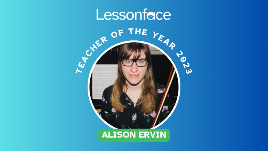Our Overall Teacher of the Year for 2023, Alison Ervin, is extraordinary in the breadth of her knowledge and teaching capability. In 2023, she taught lessons on over 20 instruments - from glockenspiel to U Bass - to over 100 students. All her reviews were five-stars out of five.