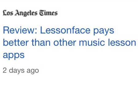 As a result of our very lean model, we tend to be very organic about our advertising and marketing efforts. We are not a venture-backed company. So articles like this review from the LA Times, screengrabbed above, are extremely welcome. Lessonface has been honored in a few media mentions in the past few months, from Parade Magazine and the BBC, to TMZ (!), and now three separate articles in the LA Times. We really appreciate the recognition, as it helps keep our platform growing, and we are able to find more great teachers, and connect them with more eager students, and so on, and I hope the reader can excuse my crowing about it in this post.