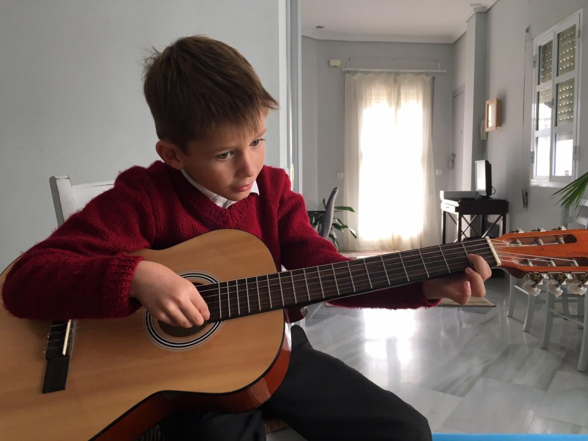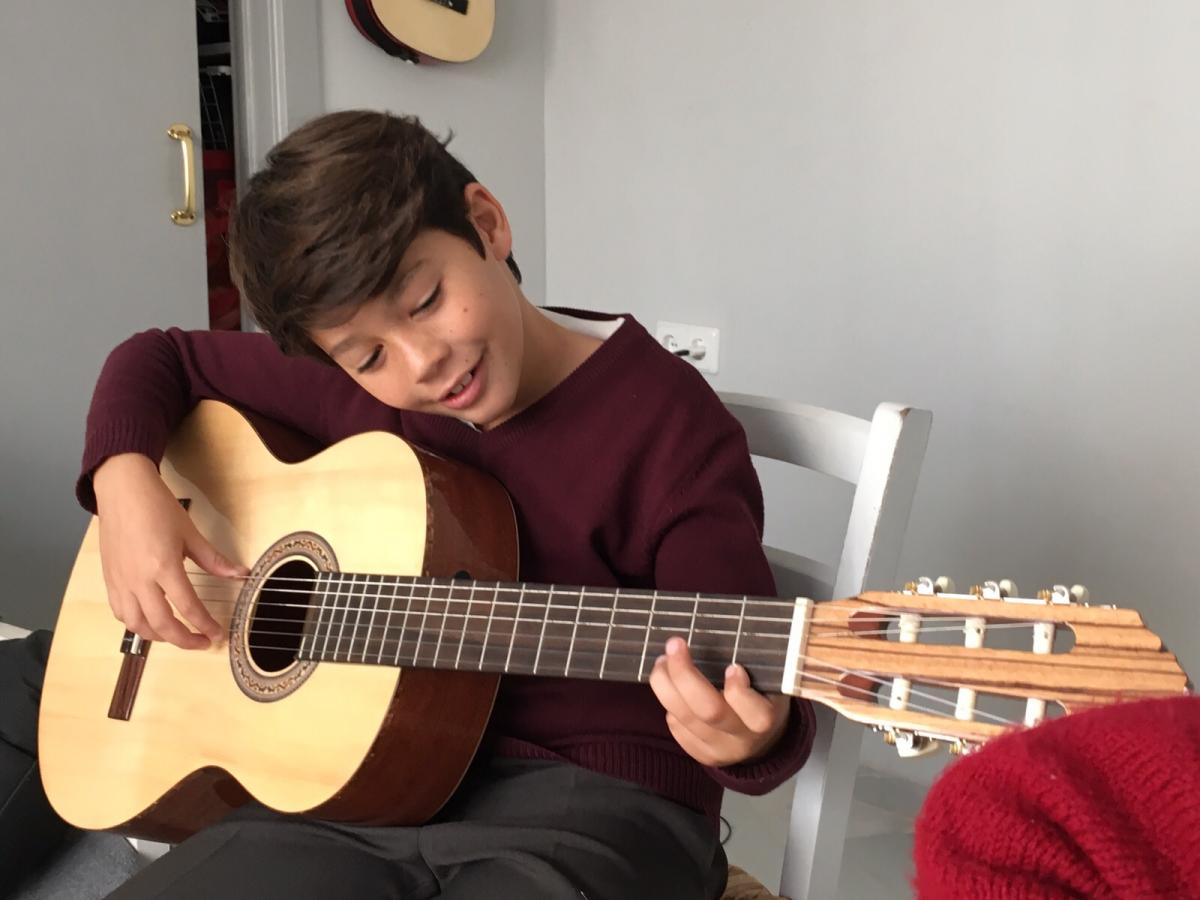 Alvaro plays a three-quarter size guitar with nylon strings.