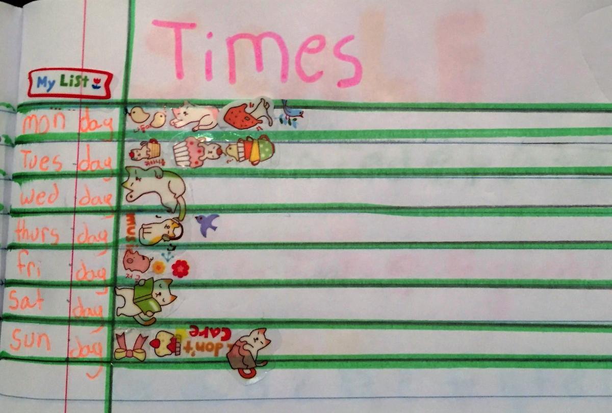 “Two examples of practice charts.  On the top is Isabella's practice log, where she puts a sticker down for every day she practices.  Below Isabella's log is an example using the practice plan above, putting one sticker down for each task, each practice day.”