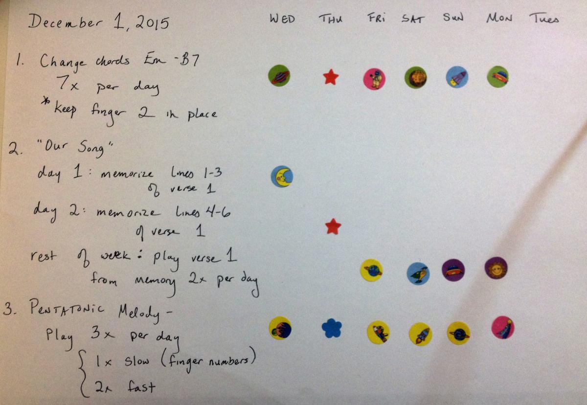 Kids love having a visual record of their practice, like a sticker chart.  One possibility is putting a sticker on a calendar for each day of practice.  Another possibility is small, task-specific stickers.  Write the objectives for the week in a notebook, with plenty of space between each item. Using the example above, which has three separate tasks, you would give your child twenty-one tiny stickers, one for each task each day of the week.  If your child is too old or too cool for stickers, check marks are just fine too.  The important thing is that your child sees when he practices and equates practice with getting the hang of a song and feeling confident in his music.
