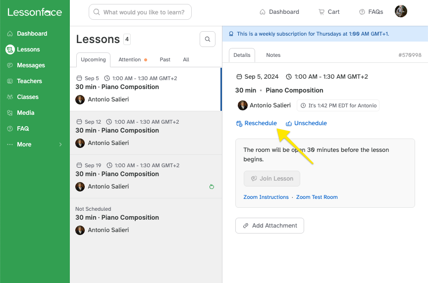 • Unscheduling a lesson removes it from the schedule of upcoming lessons without setting a new time. The lesson remains confirmed but appears as "Schedule Pending" in your lesson list. This means you won't need to go through checkout again when you're ready to schedule a new time.