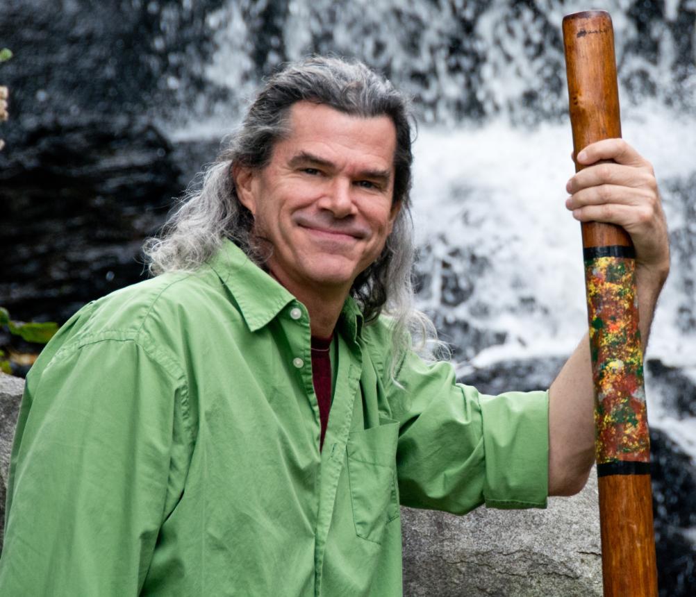 Intuition made Amy, my wife, buy a didgeridoo for me from a world music instrument catalog over thirty years ago. I immediately tried to play it, but the sound was more like a nasty shriek than a clean note. Gradually, I learned to produce a few haunting hints of the primal drone I craved. The bass growl of the didgeridoo travels right through the bloodstream. Listening to it means feeling it throughout your nervous system, bones, and skin. Playing it feels like sticking your soul into the electrical socket of the planet. I was addicted. I loved the physical vibrations and the wild sound pouring out the end of the ‘didge.’ I taught myself to make didges from bamboo, sunflower stalks, and softwood tree branches. I learned to do circular breathing, in which the player breathes while playing, allowing for continuous music.