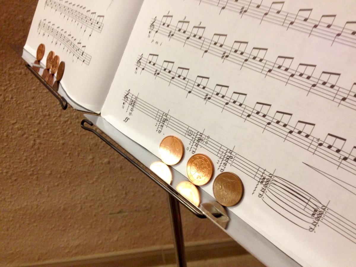 Repeating passages over and over is not the most exciting part of being a musician. You can make this process just a bit more satisfying, and enforce that you stay true to your practice goals, by representing your repetitions visually. I use coins, but any small object that fits on your music stand will work. Line seven coins up on one side of the stand, and each time you succeed at playing the passage perfectly, move a coin to the right side. Once all seven coins have been moved to the other side, you’re ready to move on. The next step is to play the same passage five times in a row perfectly. In this variation, if you make a mistake once, you have to start the whole series again – that is, all the coins go back to the left side.