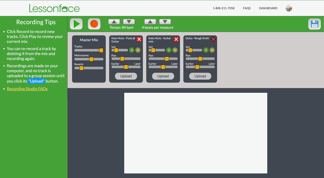 First, a little background. I am not a whiz on the computer, as my grown children will heartedly agree to. I play the flute in our local orchestra. During the covid “lockdown” time, we had to record our tracks using Soundtrap — a somewhat complicated, but effective recording program for musicians.  I admit it – this took me a while to learn, but I did. So, you can imagine my delight that when Lessonface launched their own recording studio, I took to it immediately. Not only is it convenient, but it is also very user friendly!