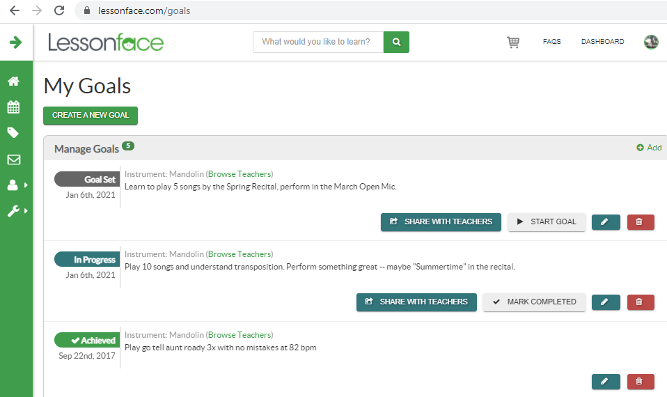 Our goal-setting tool, pictured in the screenshot, is an indicator, of course, also! Students are setting goals, marking them in progress, and "achieved," but likely, I believe, because we don't really push this tool prominently on the website it's not very utilized. Ready to set some goals for the New Year? Just log in and navigate to your profile >> Goals, or go to this link: https://www.lessonface.com/goals. The goal-setting tool is free to use, you just have to be signed into your (free) account on Lessonface to access it.