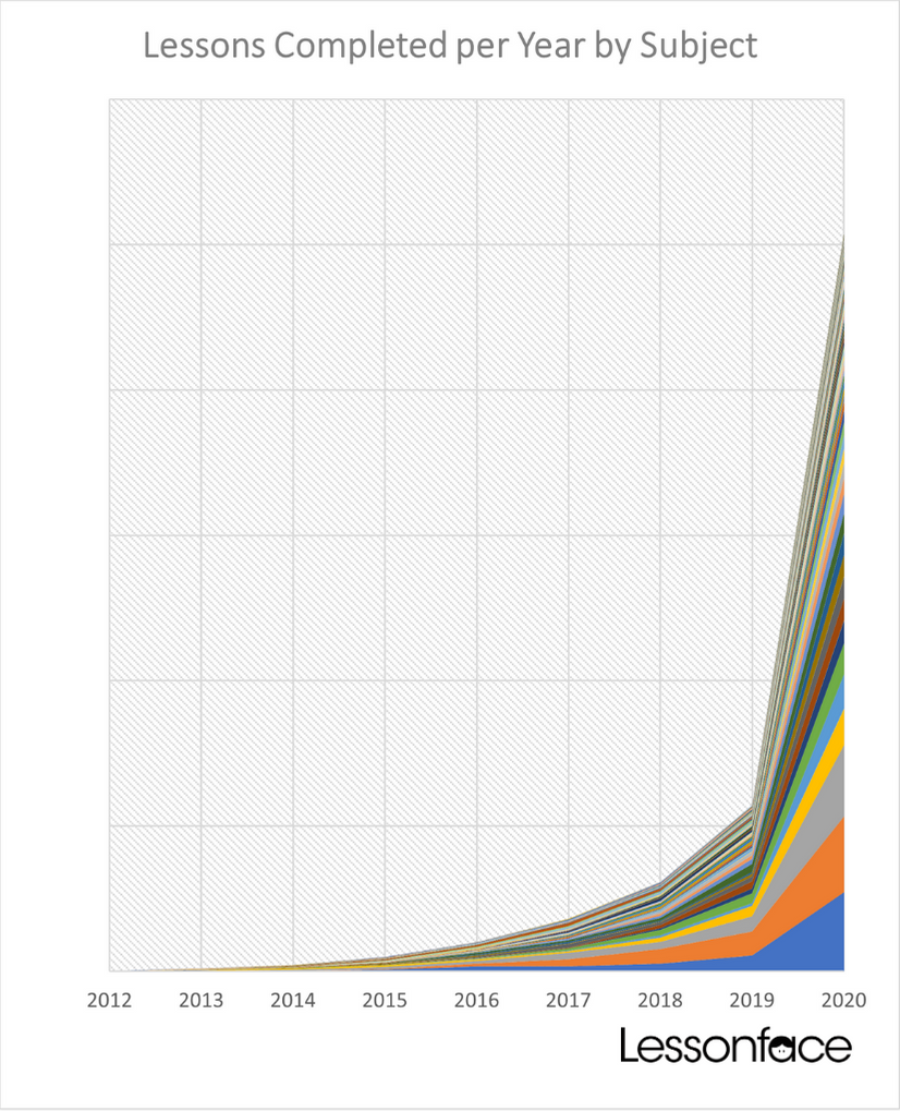 Students are taking more lessons than ever on Lessonface, both cumulatively, as you can see in the growth chart on this page, as well as as individuals. And with very few exceptions, students give their lessons on Lessonface five stars, for a average of 4.98/5 stars given for the over 5,000 reviews given in 2020 on Lessonface.
