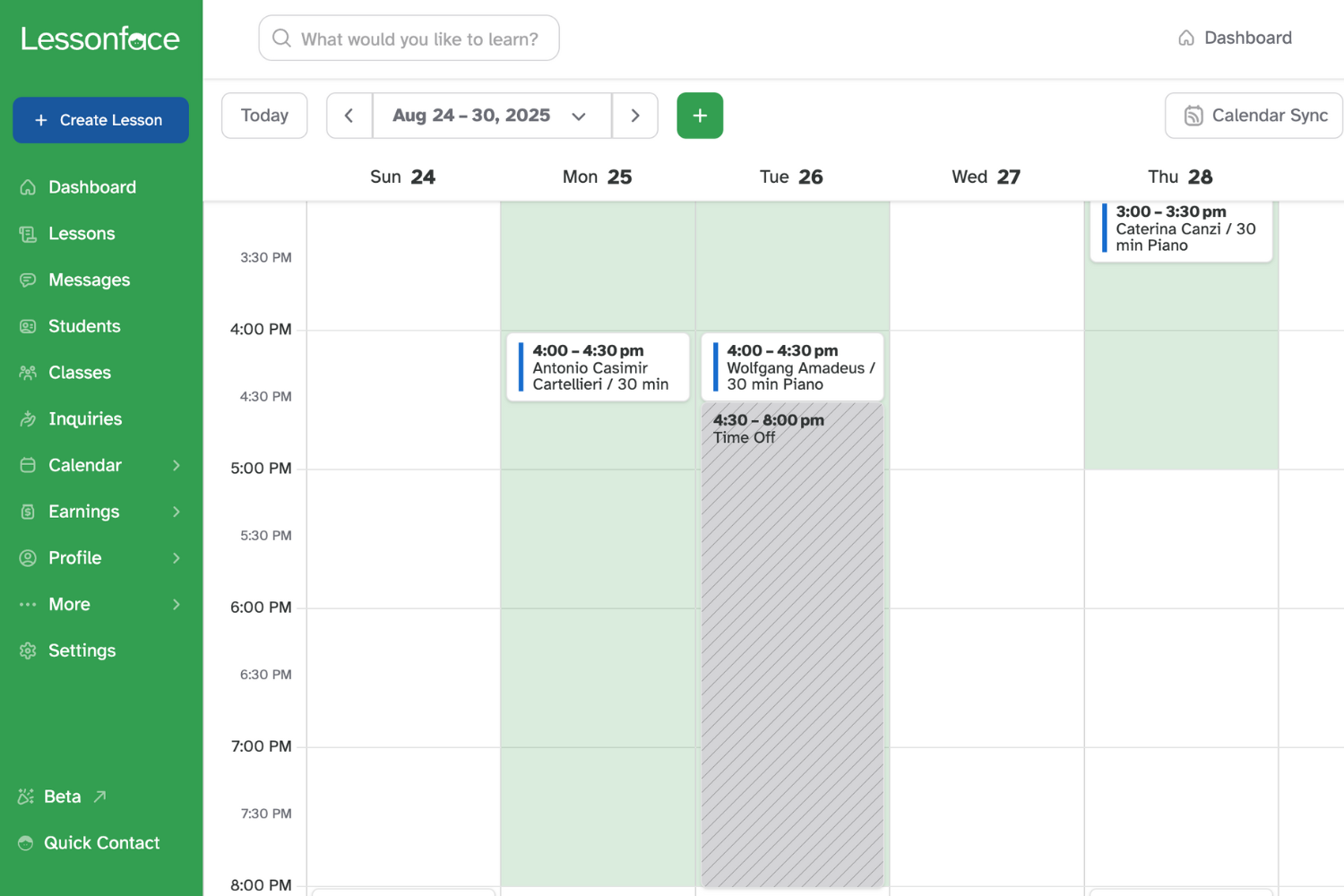 Teachers asked, Lessonface delivered! In a recent survey, teachers expressed interest in being able to sync their Lessonface calendar to an external Google calendar. We are delighted to announce that we have updated our calendar and availability features to include this new functionality, as well as a fresh design. Teachers now have the option to have their Lessonface lessons automatically added to their external calendars. Additionally, if they choose, events on their external calendars can by synced back to Lessonface calendar as "Time Off", making those times unavailable for bookings. We expect this will both save time for teachers and avoid accidental conflicts and double-bookings. Students, too, can view their Lessonface activities (lessons, group classes, recitals, etc.) in the calendar view, which is accessible in the green left-hand menu. The new calendar and availability features should be mostly self-explanatory, though if you'd like a guide on what's new, please read on below.