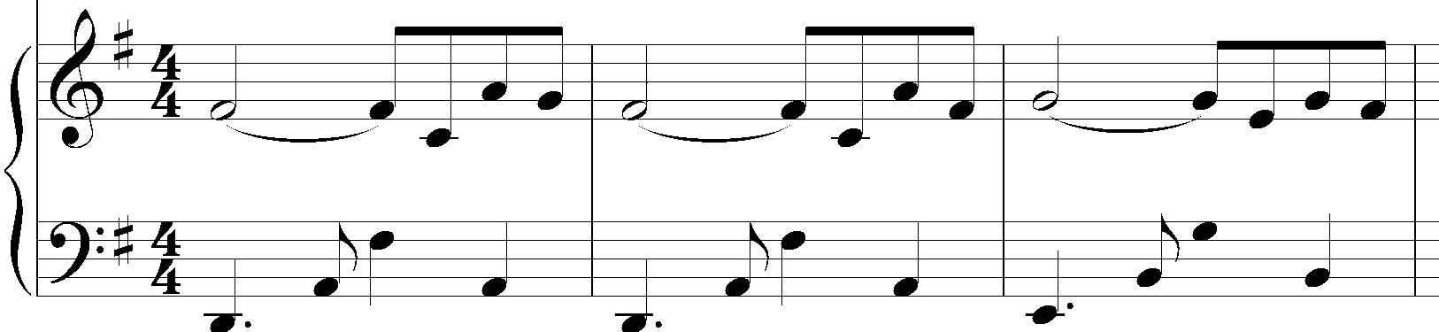 This point builds on the previous one. In fact, just to do the previous exercises you already need to synchronize with the metronome. But it’s one thing to be able to keep a steady beat on your own, playing solo, and quite another thing to be able to keep a steady beat while hearing someone else playing a part that is different from yours. This is important in group playing, and you can simulate that experience when you practice with the metronome. In the example below (Figure 1) the accompaniment keeps repeating the same rhythm. When you’re practicing the melody in the top voice if you set your metronome to play groups of 3 beats and you omit the second one (or just give it a softer sound) you’ll end up with the rhythm of the accompaniment. This can be a useful way to practice the melody on your own before you combine the two parts or voices.