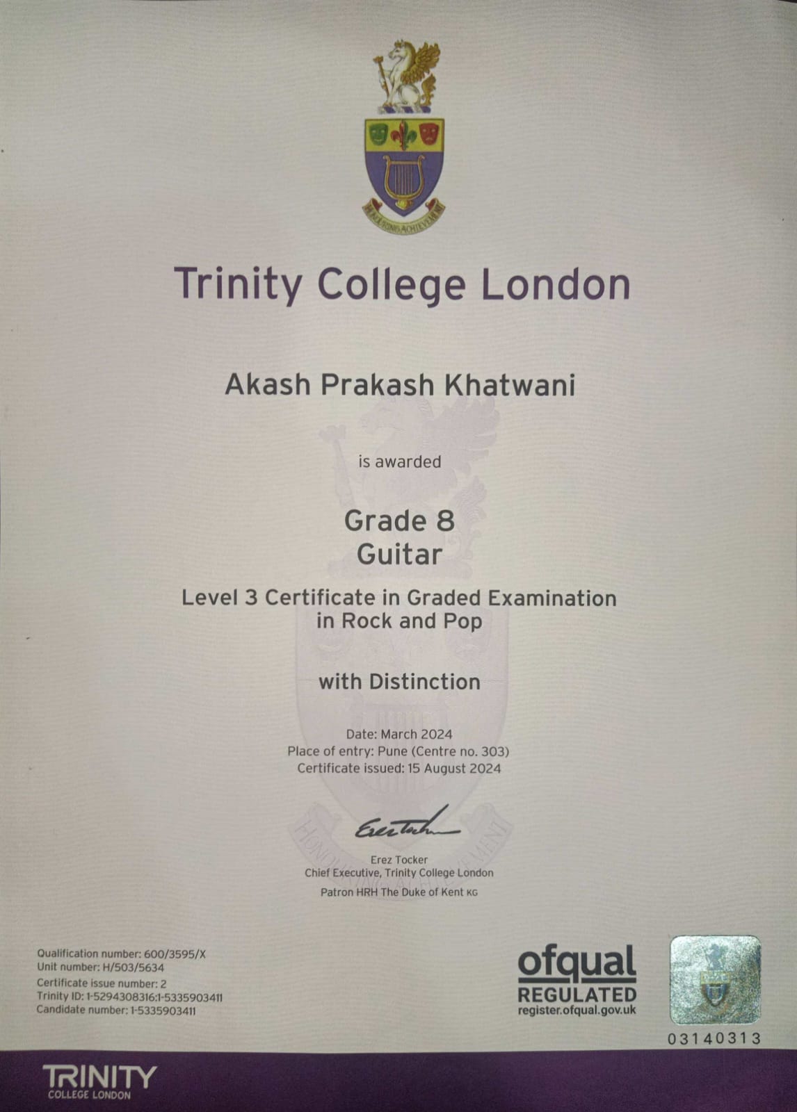 Trinity College London – Grade 8 Rock & Pop Guitar (Distinction)