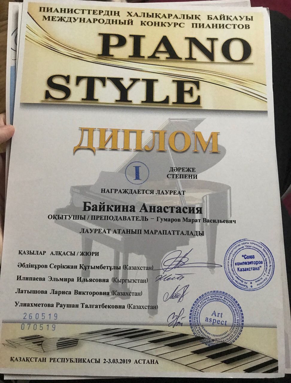 - 1st Prize at Astana Piano Style (Kazakhstan)