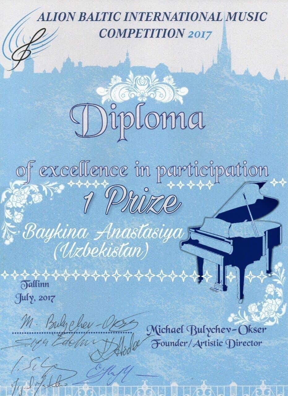 - Bachelor’s Degree in Piano Performance from the State Conservatory of Uzbekistan