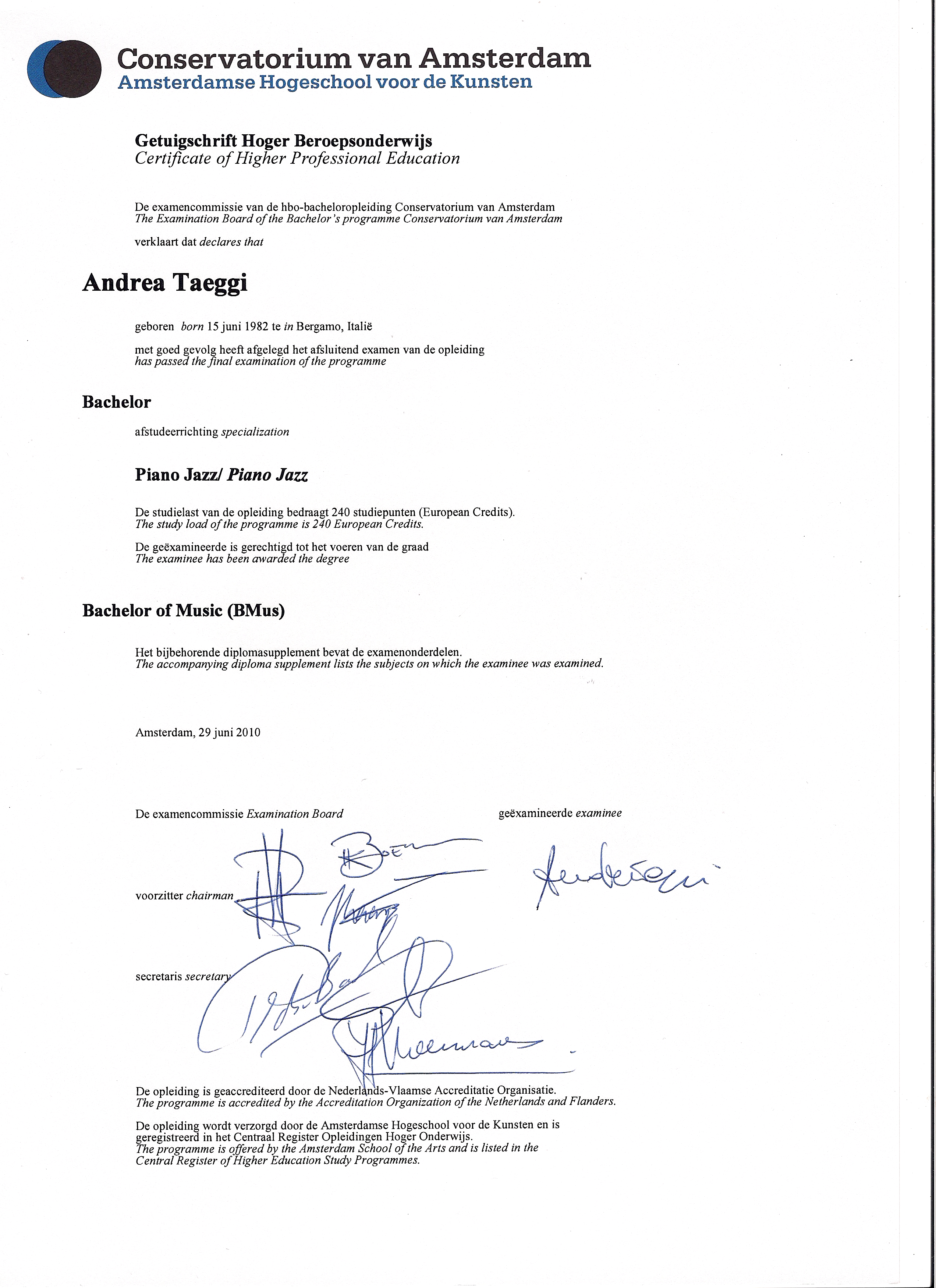 Here you can take a look at my diploma obtained in the Amsterdam Conservatory. It was a 4-year course, 240 ETCS.