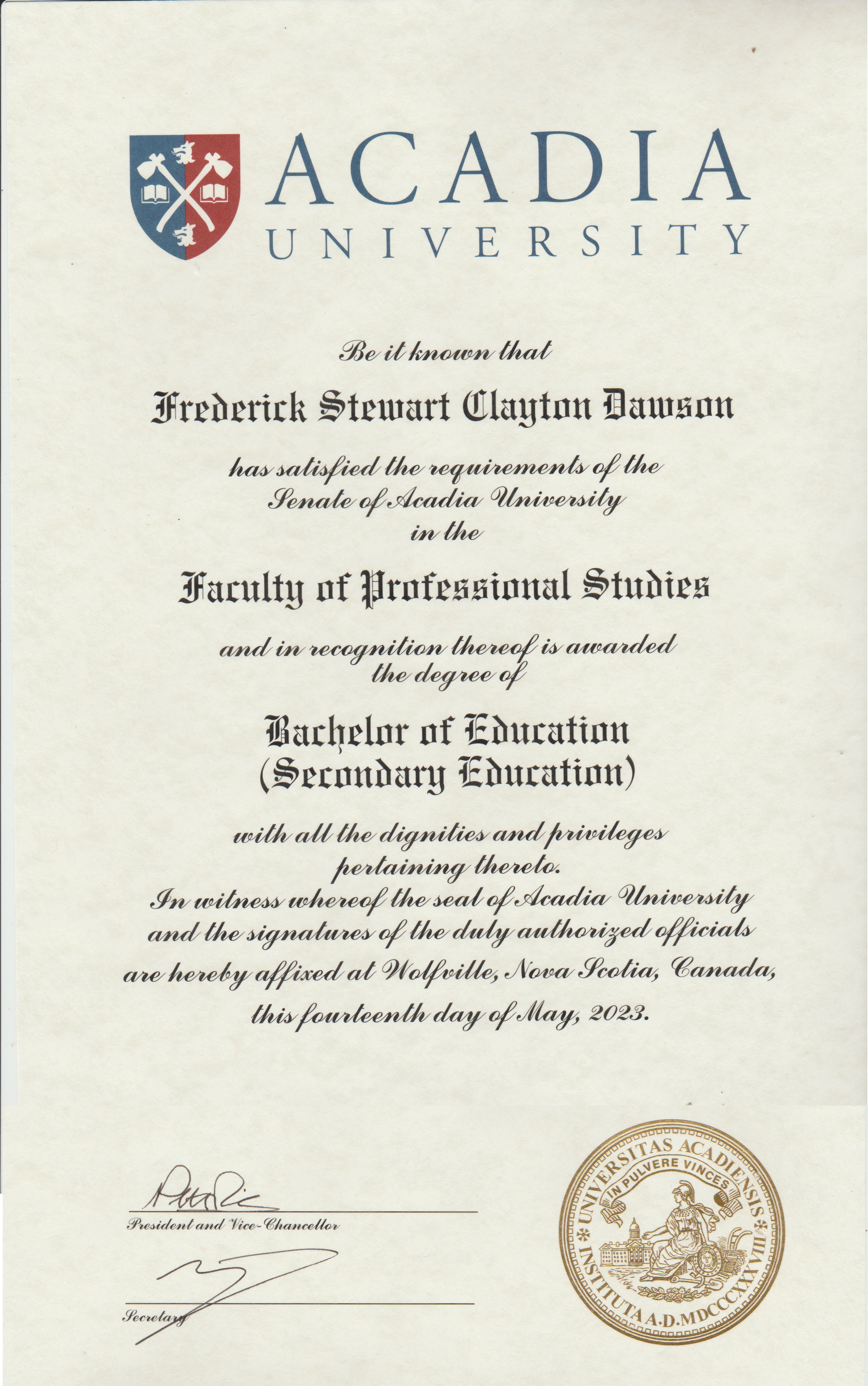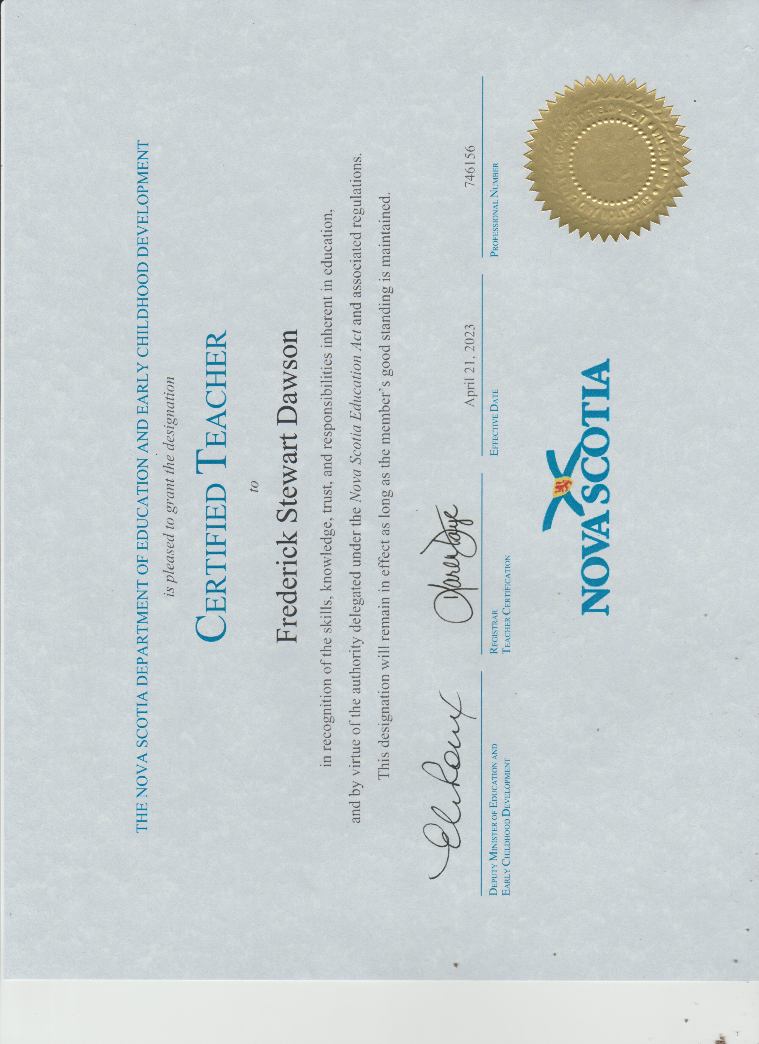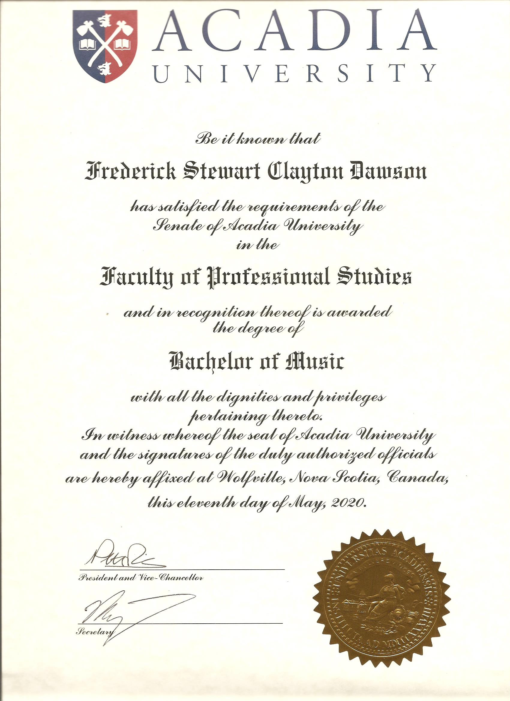 Music Degree (with a specialization in Education) from Acadia University Diploma from the Gulf Island Secondary School of Music Specialization Several years of teaching private lessons across various instruments In the next two years: Education Degree from Acadia University