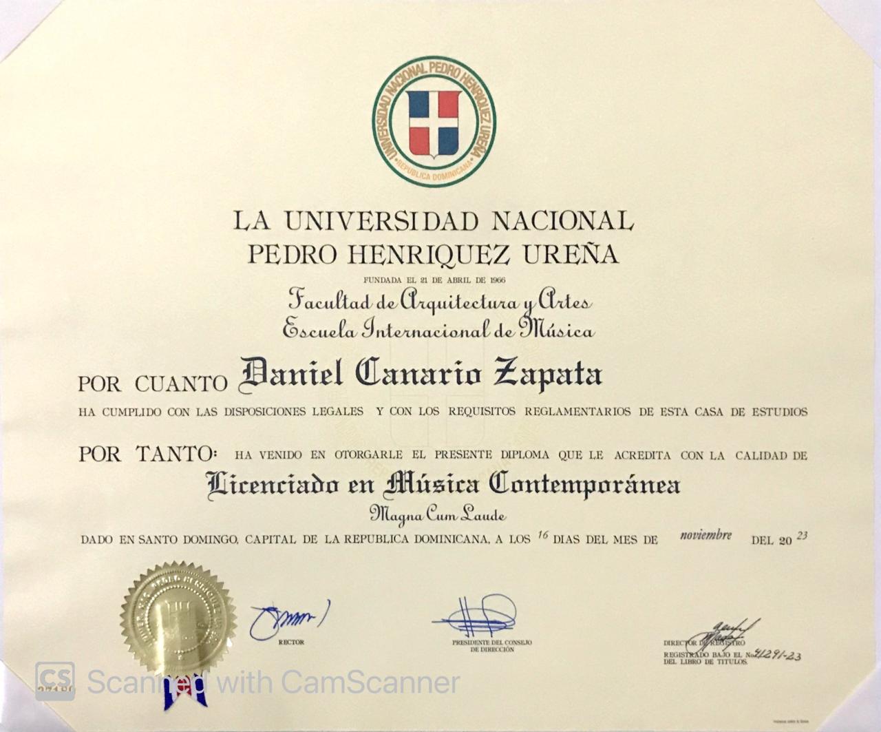 - Bachelor in Contemporary Music Studies Universidad Pedro Henríquez Ureña (UNPHU), Santo Domingo, República Dominicana. Major: Composition, Arrangement and Production Magna Cum Laude 2017-2023.
