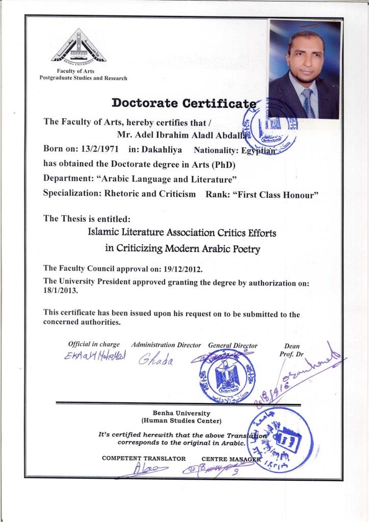 DOCTORATE OF PHILOSOPHY (PHD) IN ARABIC LANGUAGE AND LITERATURE, 2012