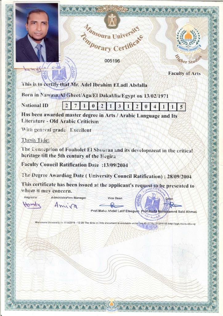 MASTER OF ARTS (M.A.) IN ARABIC LANGUAGE, 2004