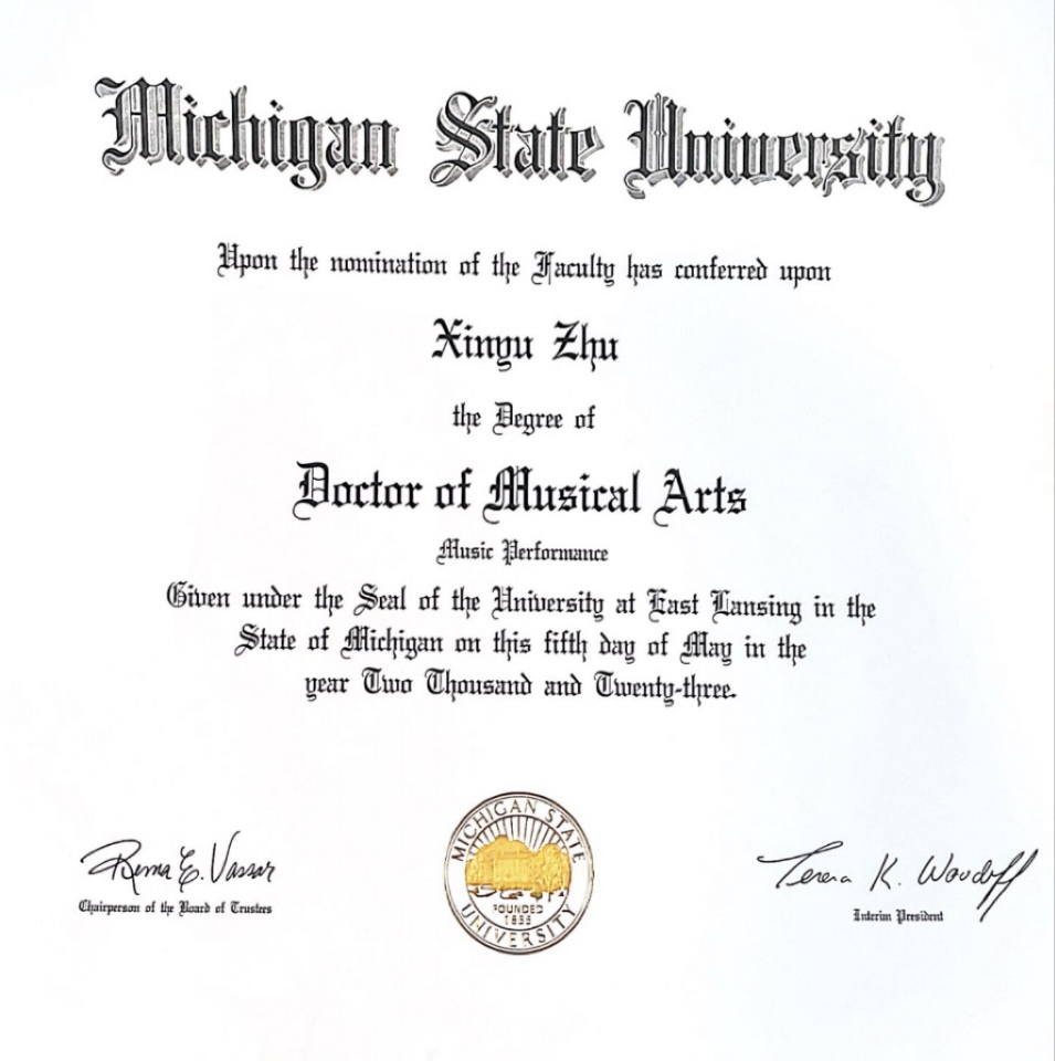 - Doctor of Musical Arts (DMA) in Violin Performance, under Dmitri Berlinsky, Michigan State University, Michigan, USA (Aug 2019-May 2023)