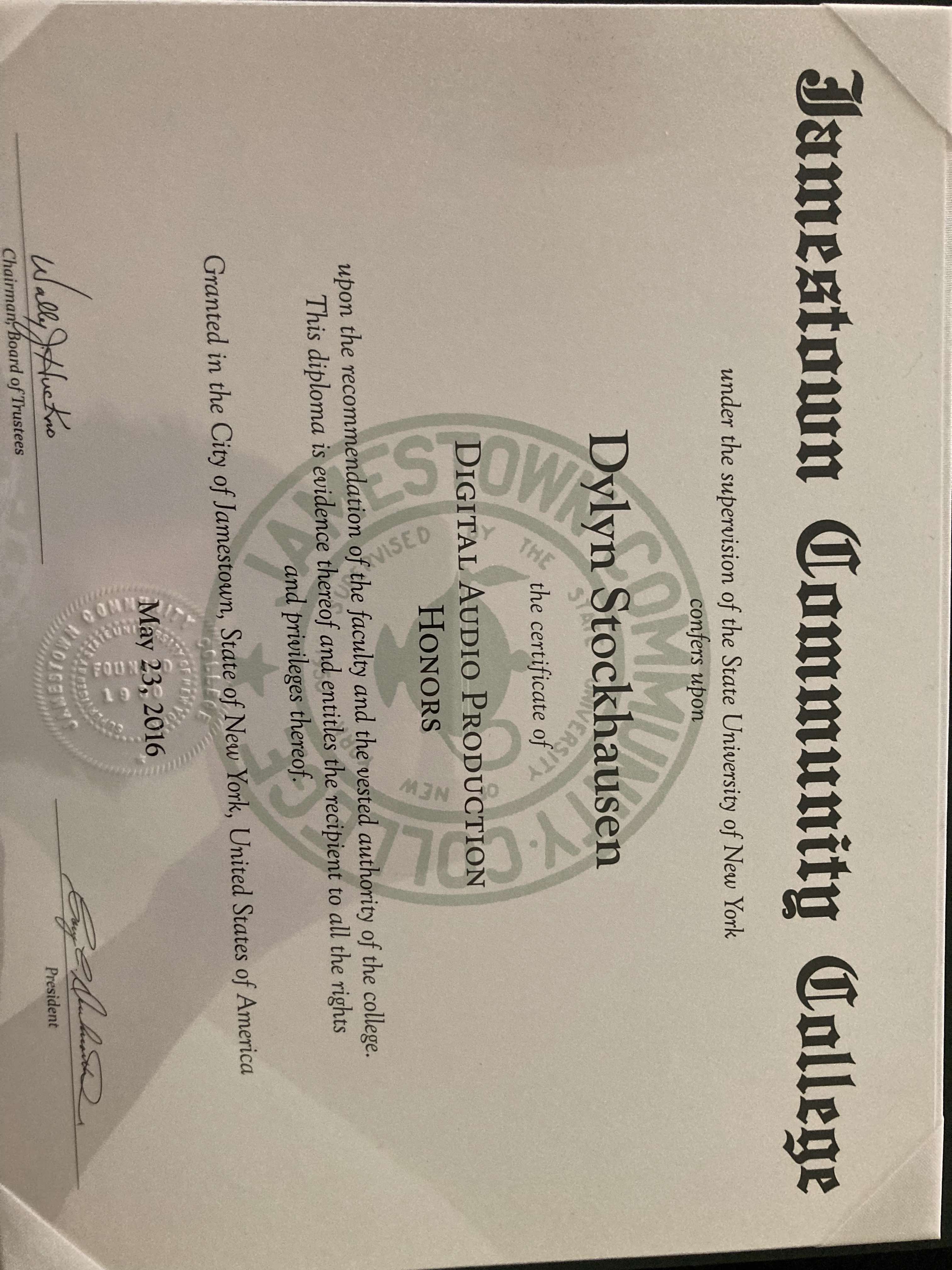 Honors Certificate- Digital Audio Production- Jamestown Community College