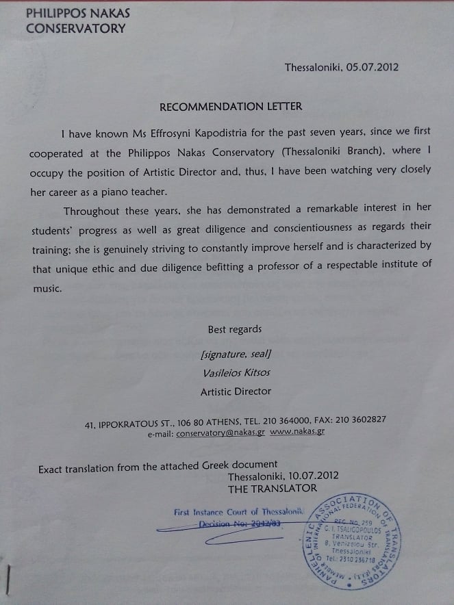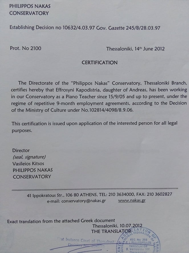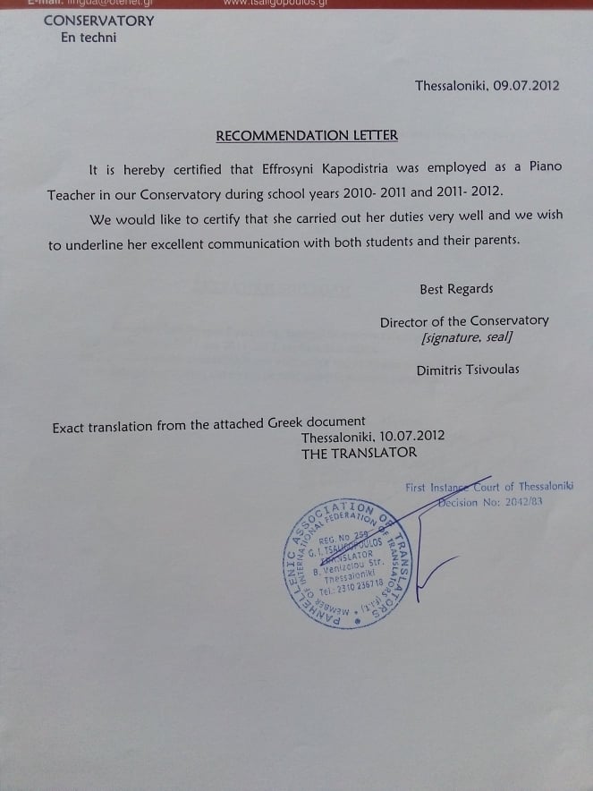 senior music theory of the Aleksandreio Conservatoire Thessaloniki. Two years later she received a Bachelor of Music in Piano Performance and Pedagogy.She has also participated in piano and music theory seminars with professors such as D.Toufeksis, G.Hatzinikos, P. Adam, M.Kapatsinskaya, M. Tirimo, N. Astrinidis, C. Samaras, P. Crammer.