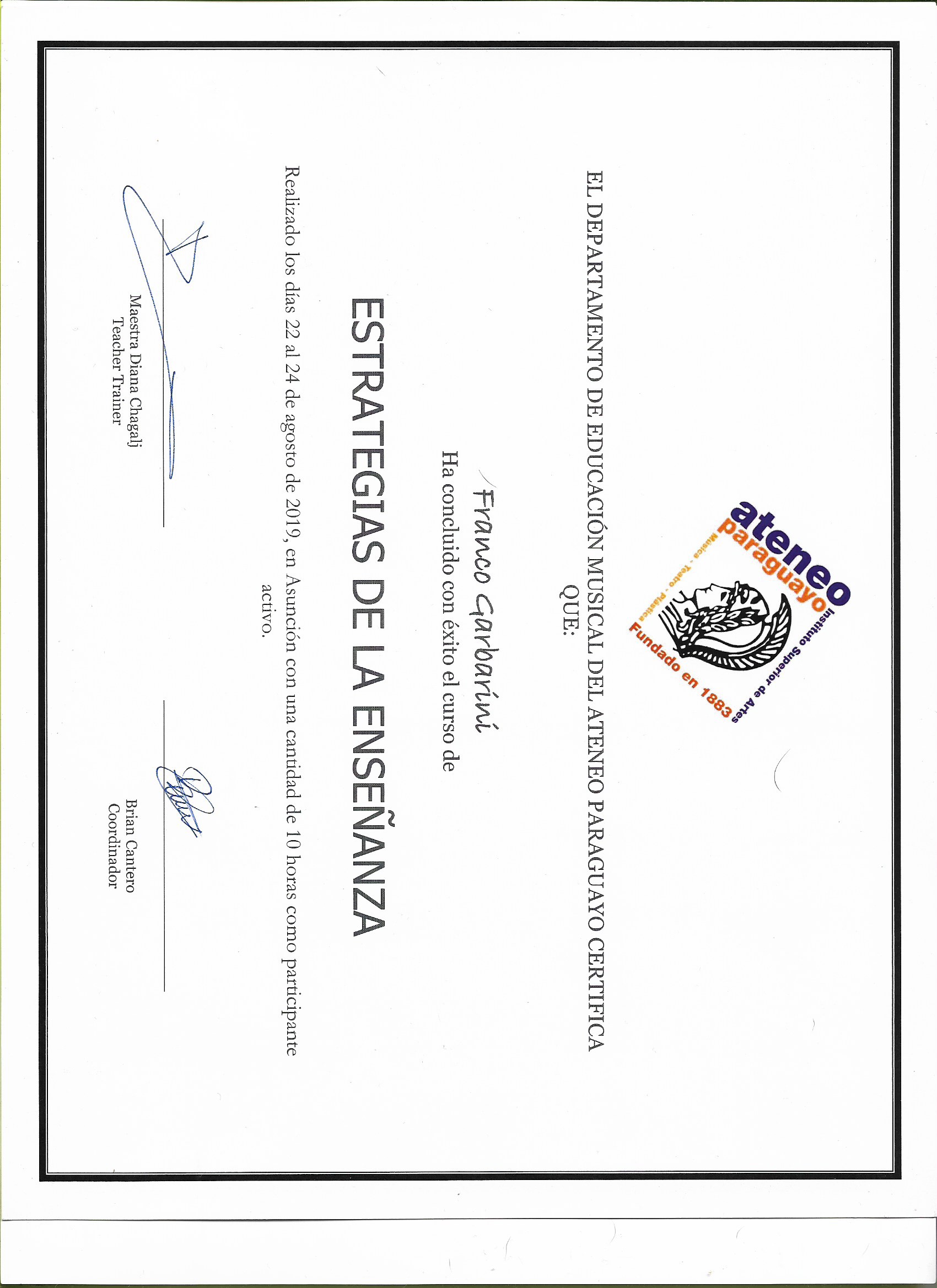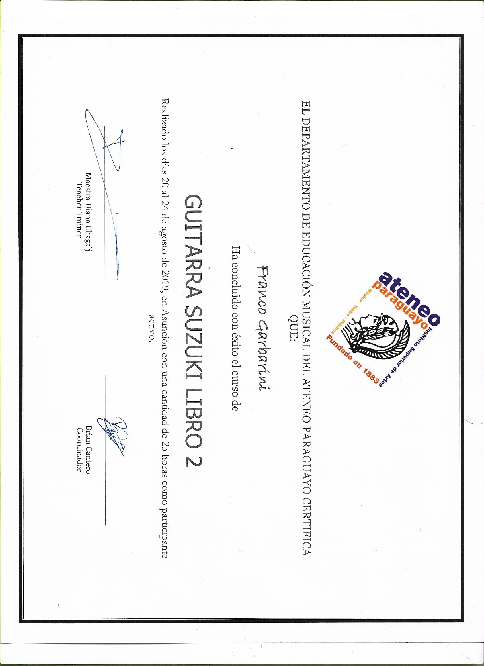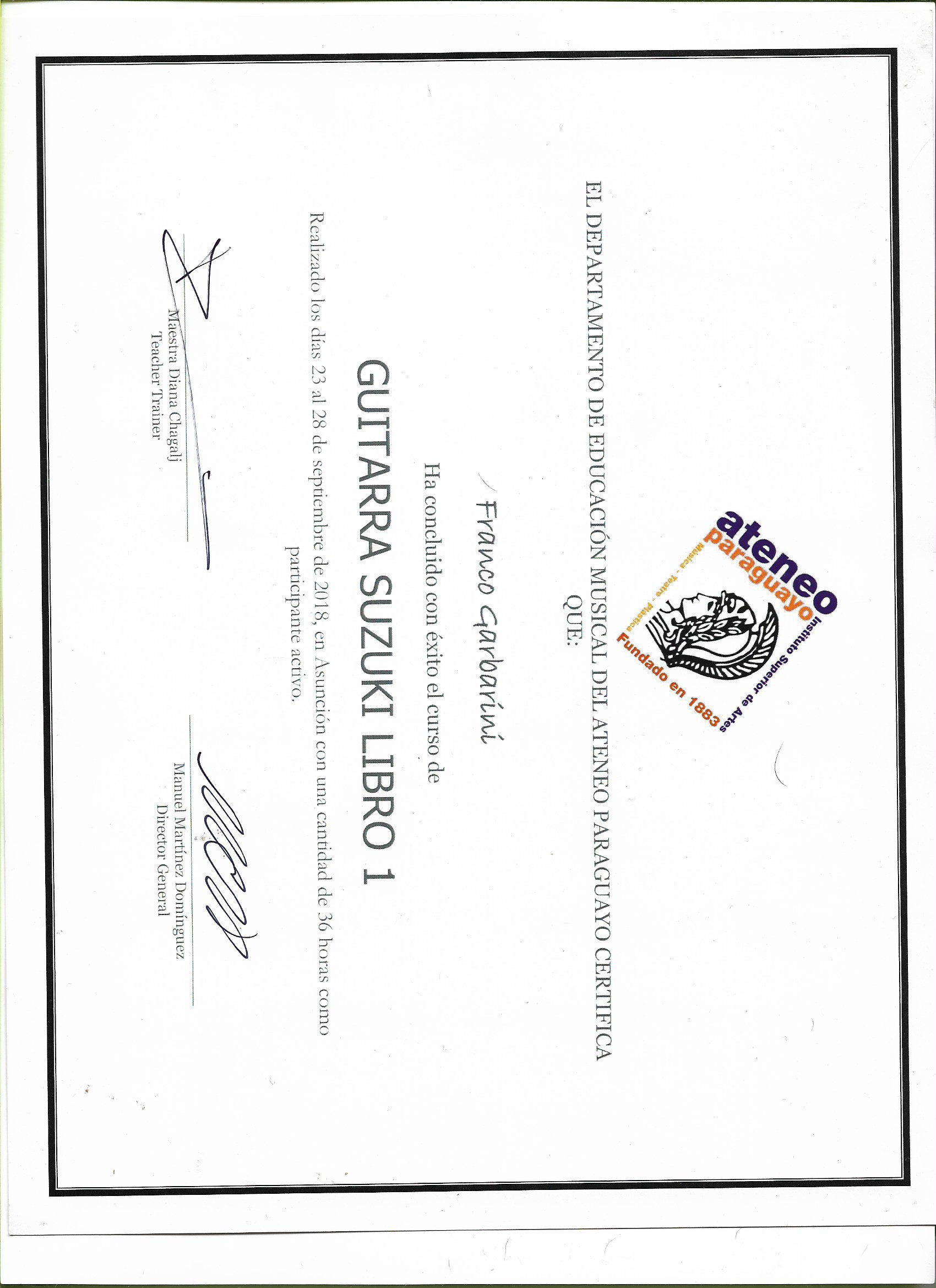 - Tertiary (Vocational Training in the artistic field - musical) • 2011 – 2022 School of Popular Music of Avellaneda (EMPA) Instrumental Guitar Technique in Popular Music - Tutorials - Electric guitar lessons (Rock) – Robert Fripp's pick technique – with Sebastián del Muro Eiras - Folklore-jazz guitar classes with Nestor Gómez - Musical artistic experience - Guitarist in Ragazzas (Rock-Pop) 2009 – 2014 - Guitarist in Duo Roldán – Garbarini (Folklore-Jazz projection) 2018 - 2020 - Training in teaching • 2017 Philosophy Course Suzuki Method Prof. Diana Chagalj and Patricia Pasmanter • 2018 Suzuki Method applied to Guitar (Book 1) Prof. Diana Chagalj • 2019 Early Childhood Musical Stimulation Prof. Laura Maldonado • 2019 Suzuki Method applied to Guitar (Book II) Prof. Diana Chagalj • 2020 Suzuki Method Pre-Estrellita Prof. Diana Chagalj