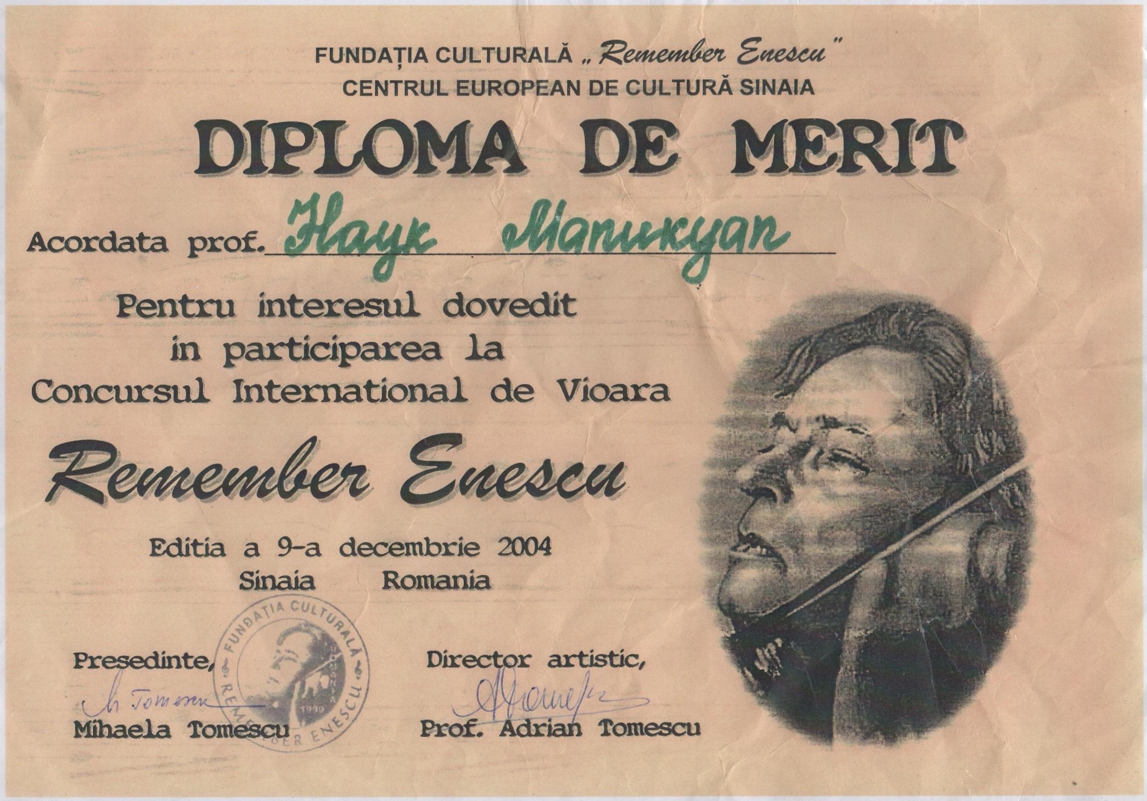 In 2006, I received the Diploma of Pedagogical Merit at the International Violin Competition “Vioara – Remember Enescu.”