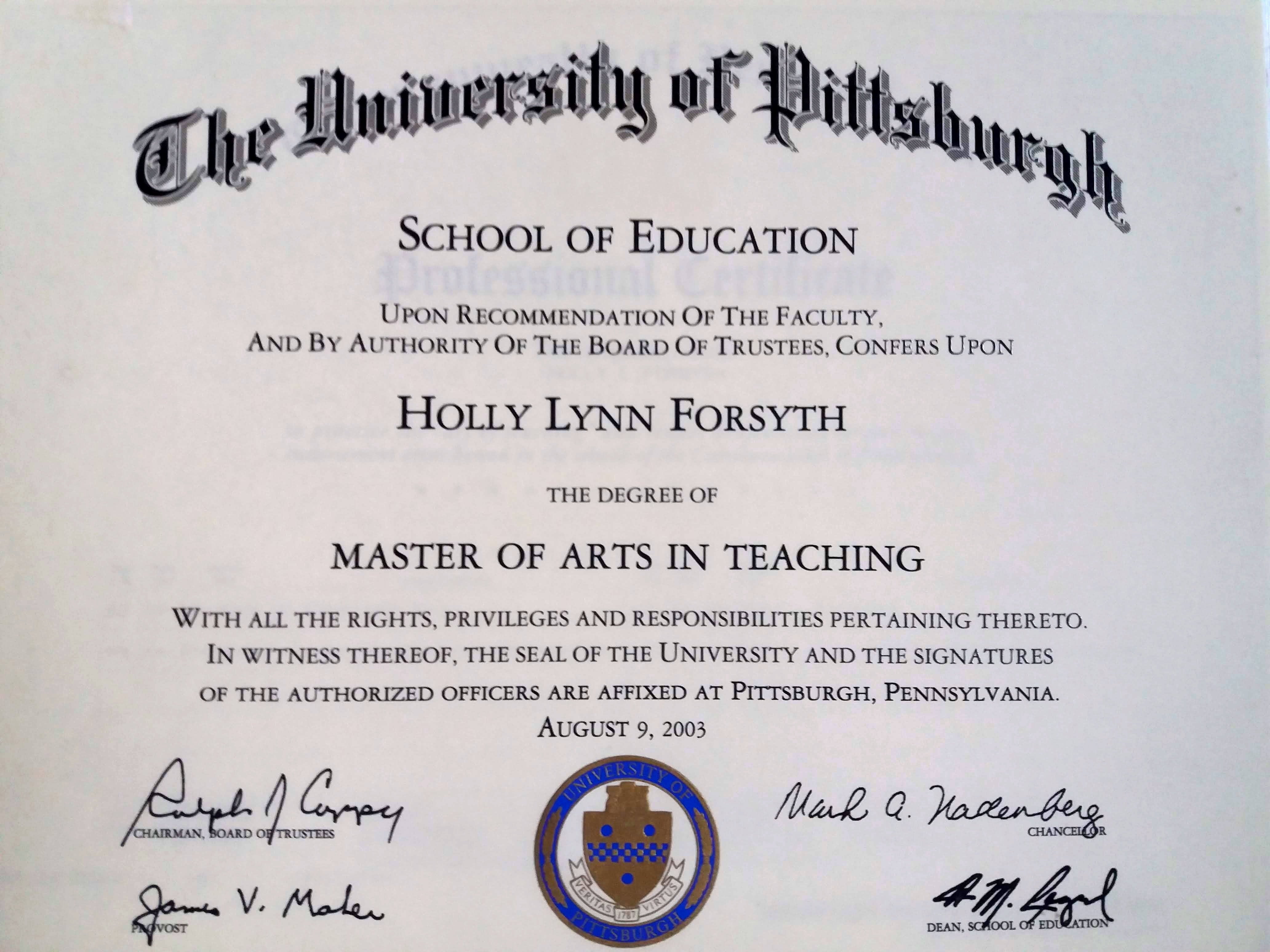 Master's Degree in the Arts of Teaching from the University of Pittsburgh