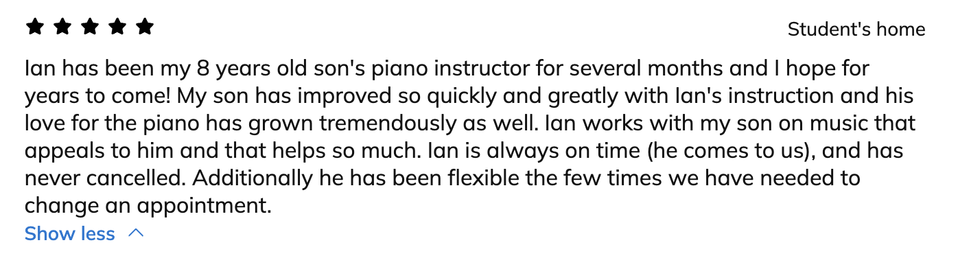 Ian brings extensive experience and passion for music education to his students. With over 15 years of teaching private piano and guitar lessons both in-person and online, he has nurtured the musical talents of countless students, instilling in them a love for music that lasts a lifetime.