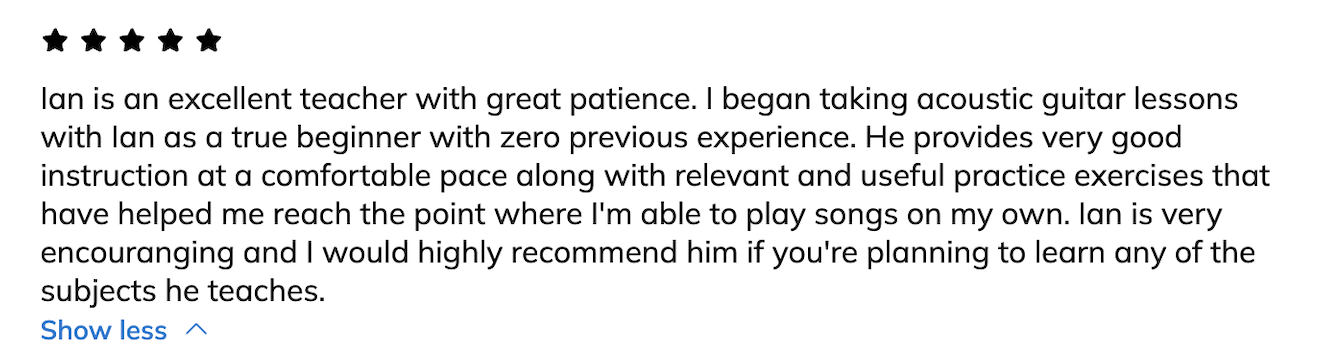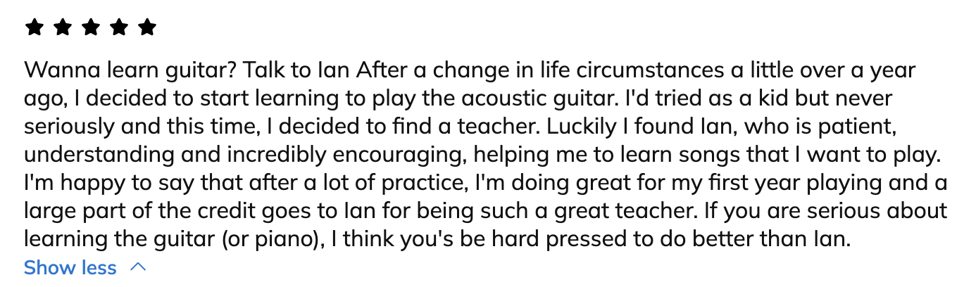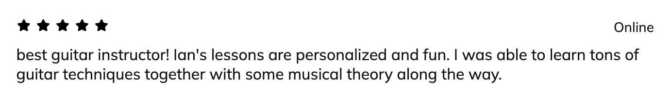 When we meet, we will discuss your goals and come up with a plan to achieve them, and begin learning right away. I tend to focus on songs that the student wants to learn and then gear the lessons toward gaining the skills needed for that.