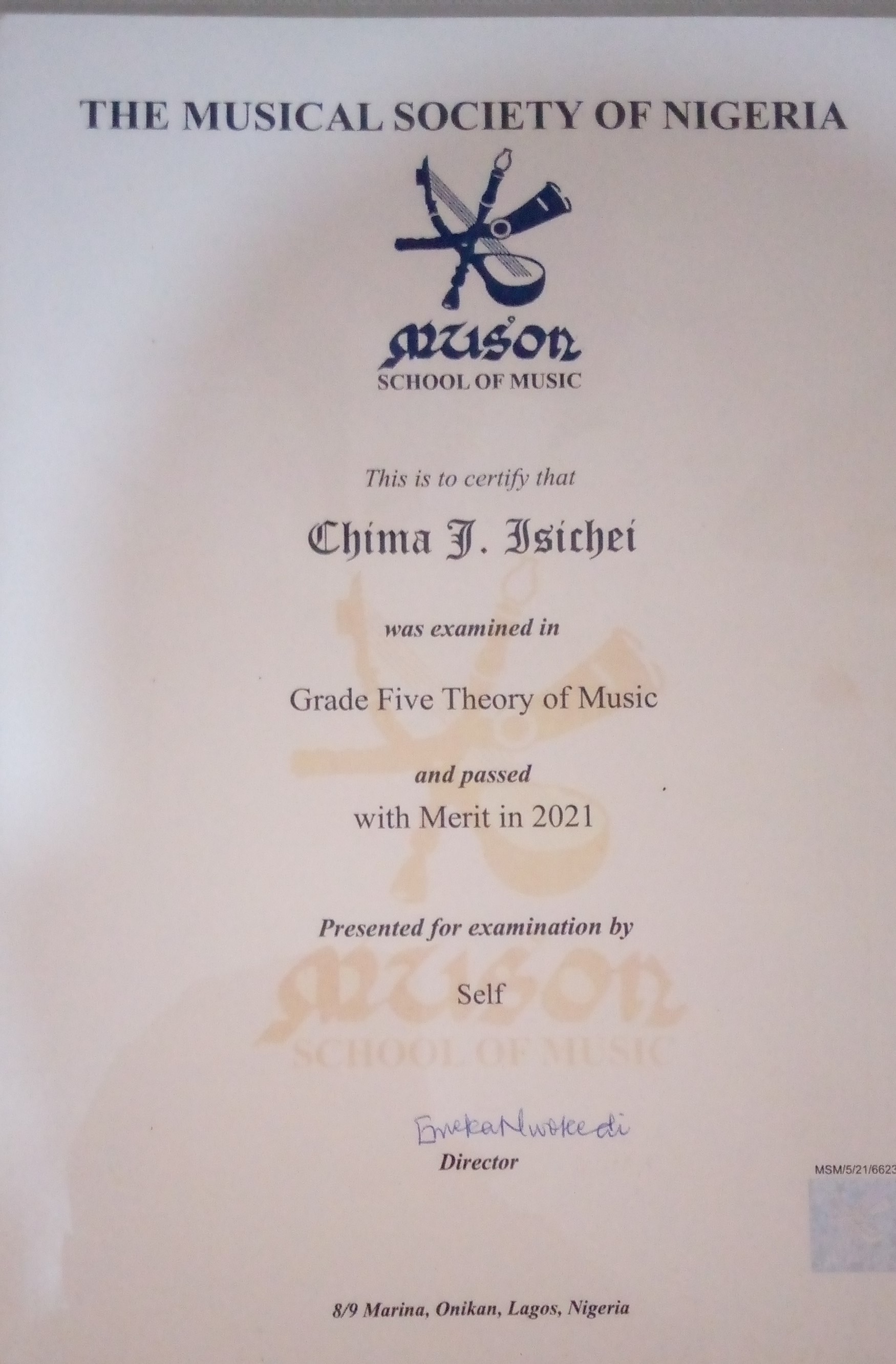 Grade 5 Certificate in Music Theory (MUSON), Lagos, Nigeria.