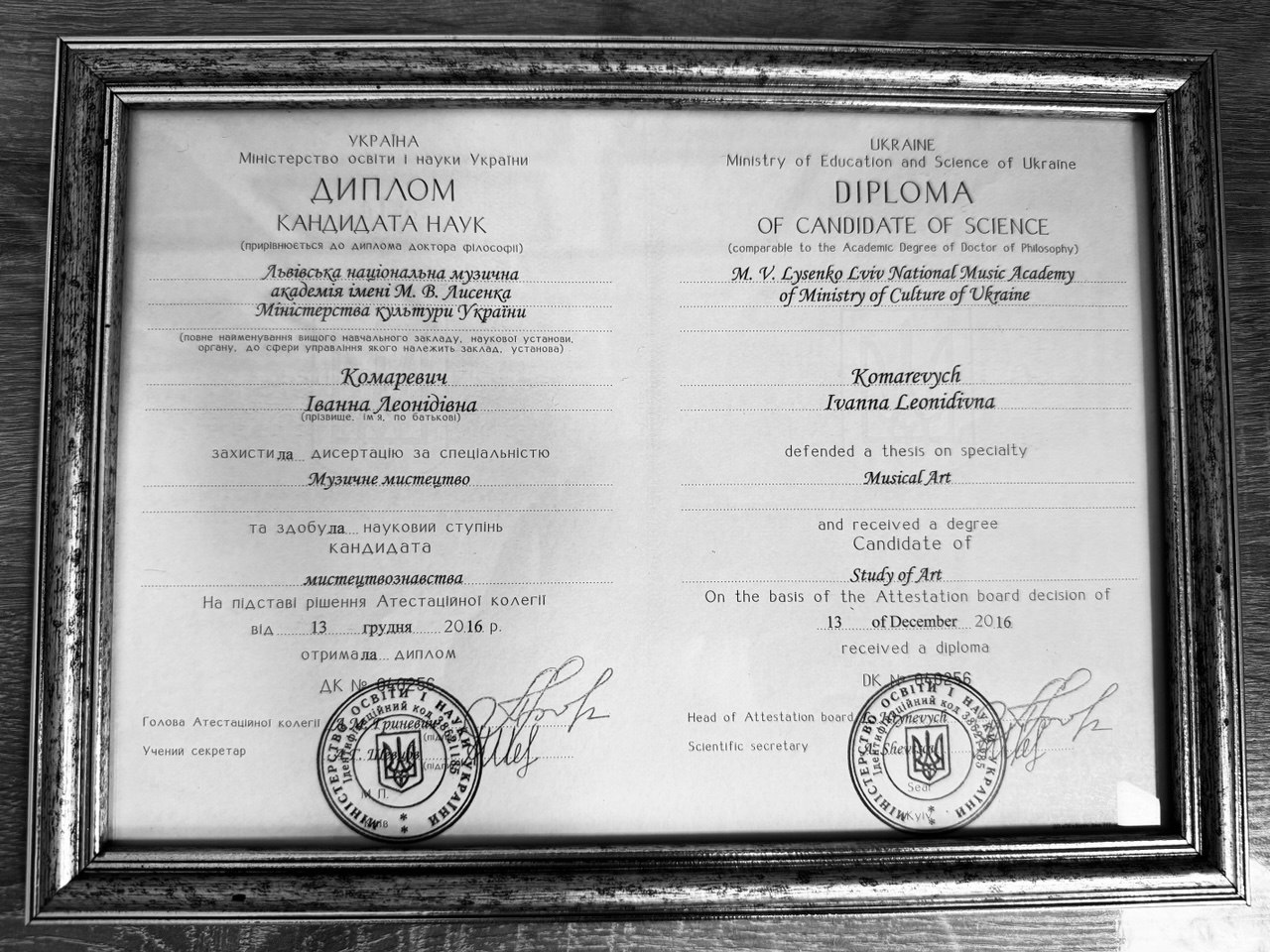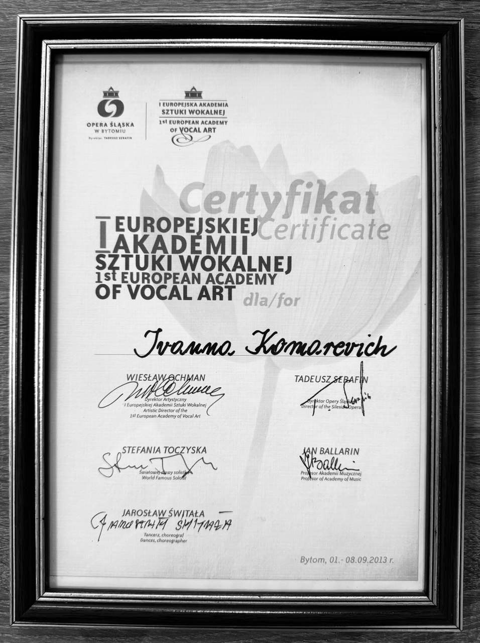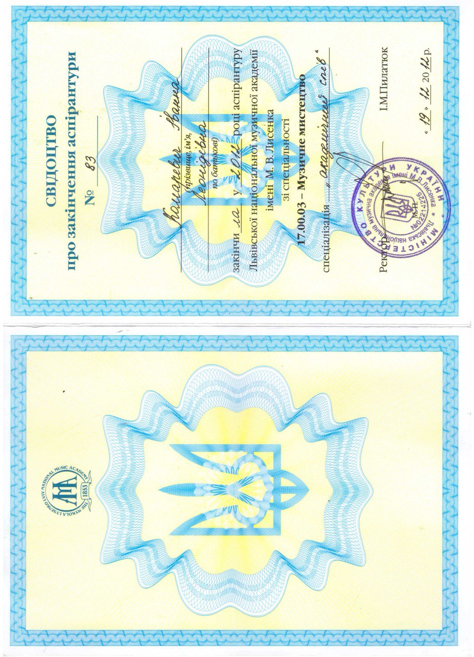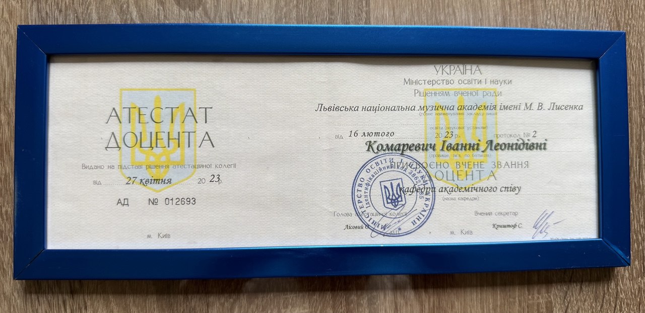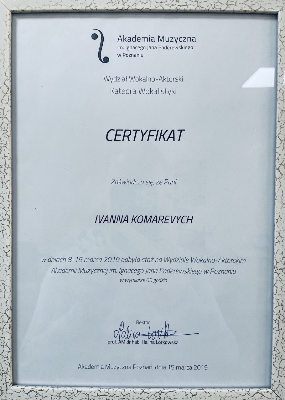 Ivanna Komarevych is an associate professor at the Lviv National Music Academy. M.V. Lysenko, candidate of art history, doctor of philosophy, opera singer. She was certified by “1st European Academy of Vocal Art” - opera Slaska in Bytom (Poland, 2013). In 2015, she received the medal "LABOR GLORY" of the II degree from "MATIS". She interned at the vocal and acting department at the Poznań Music Academy. I.Y.Paderevsky
