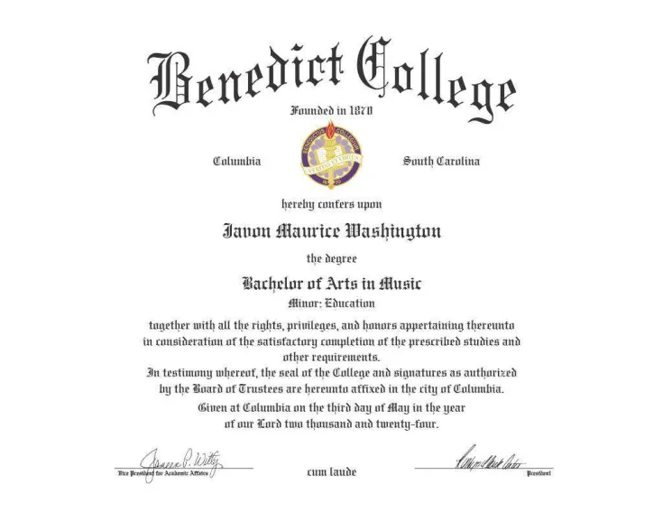 Hello, my name is Javon Washington. I am from Hopewell, Virginia. I started my music path since 7th grade. My first instrument was euphonium/baritone horn, which I've played from 7th grade to my freshman year in college. My second instrument was trombone where I have played from 10th grade to my 5th and final year in college. I graduated from Hopewell High School in the year of 2019. I've made first chair in symphonic band playing euphonium, I was also eligiable to audition for all state. I graduated from Benedict College with a Bachelors in Music with an education minor and my applied instrument for my degree was trombone. I've also played bass trombone since I started college. I've been a member of Phi Mu Alpha Sinfonia Music Fraternity of America Inc. since Spring 2022. I've played in the HBCU National Band Director Consortium All star jazz ensemble in 2022 as 3rd trombone. I am also apart of the 369th Experience Band since June 2022. During my years in college, I've played with the Benedict College Marching Band of Distinctions, the Benedict College Wind Ensemble, as well as the Benedict College Jazz Ensemble. I was also the trombone section leader of the Benedict College Band program from 2020 to 2024.