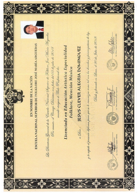 Bachelor’s Degree in Artistic Education, Music Specialization – Escuela Nacional Superior de Folklore “José María Arguedas” (now Universidad Nacional de Folklore), Lima, Peru (2012–2016). Ranked first in my class for four consecutive years.
