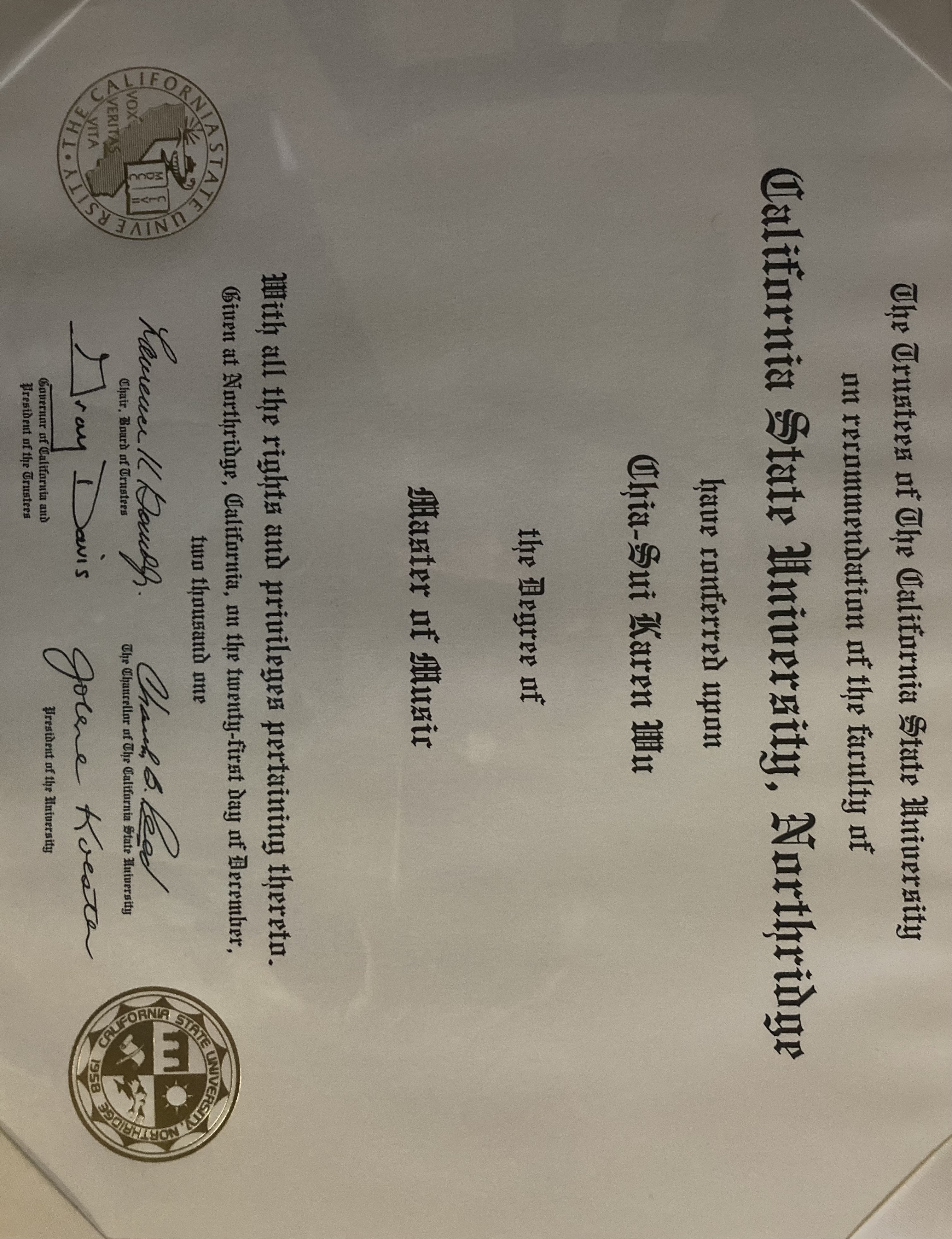 I had earned Bachelor's and Master's degrees in Music, emphasized in Piano Performance back in early 2000 from California State University st Northridge. Also won the CSUN Concerto Competition with Rachmaninoff Piano Concerto No.1 upon graduating. I was a member of Kabas Trio and formal Coordinator of CAPMT Sonata/Sonatina Competition until 2011. I have become a member of MTAC & MTNA since 2005, sending numerous students to participate their festivals and competitions throughout the years, and some had won the Sonata/Sonatina Competition and Bach Competition from NVMTA in Virginia since 2020.