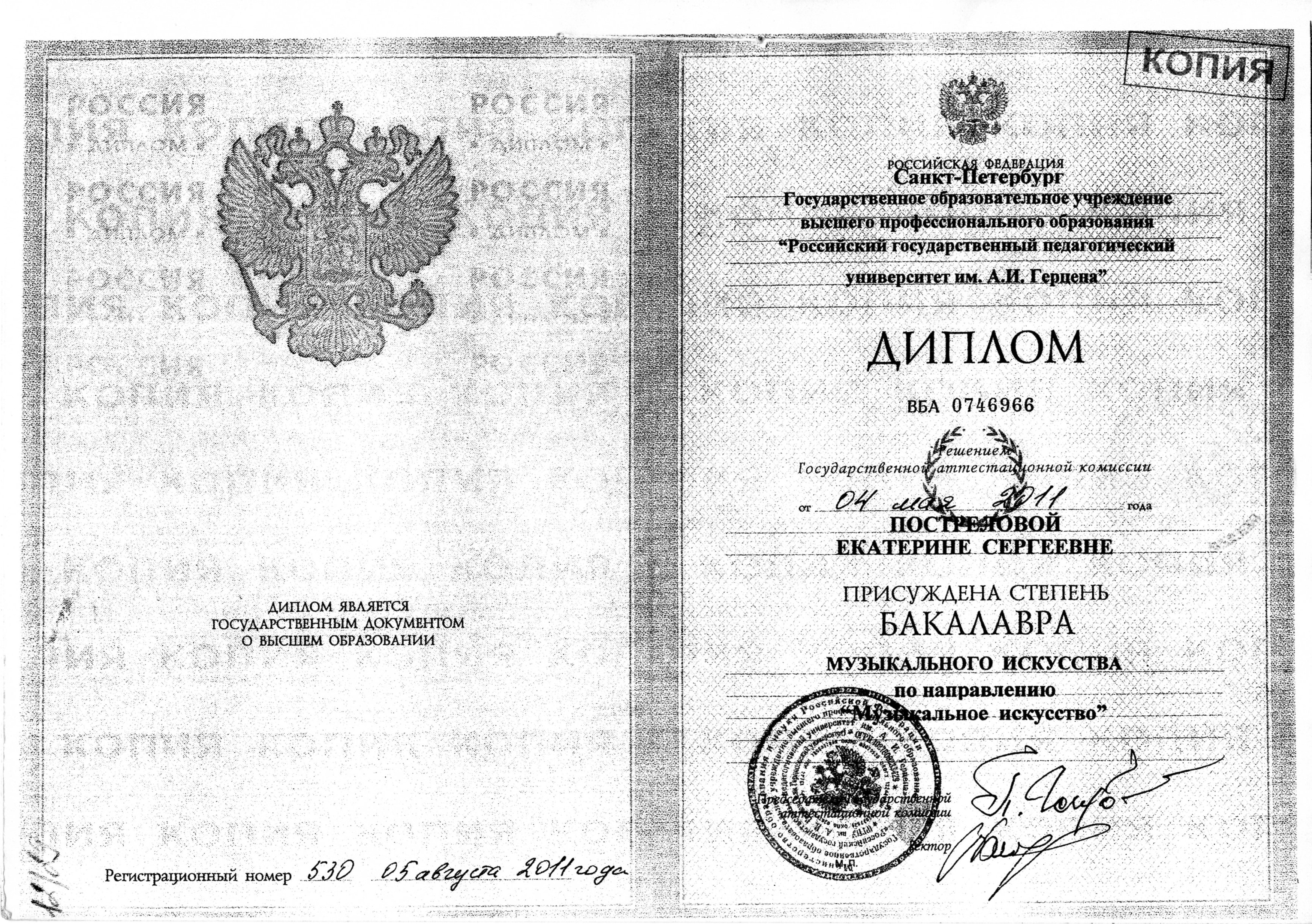 - BA in music (2011) in Musical Arts from Herzen State Pedagogical University, St. Petersburg, Russia