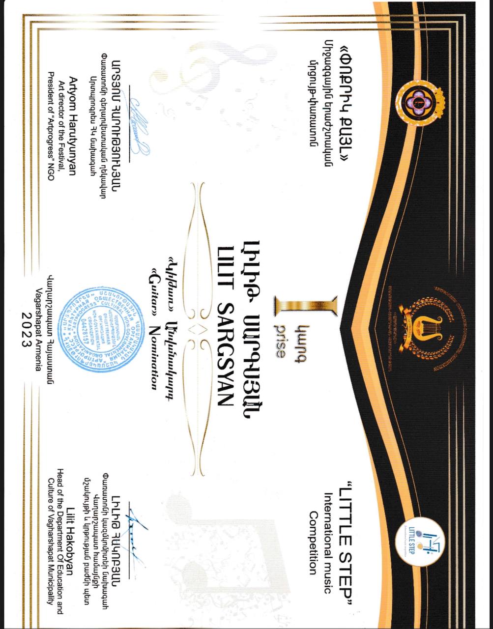 Over the past few years, I have been recognized in several national and international competitions. Most notably, I was awarded the Grand Prix at the AGBU Discovers Talents 2024 competition. As part of this special recognition, AGBU gifted me a handcrafted guitar made by a professional luthier — a meaningful and inspiring support in my artistic journey.