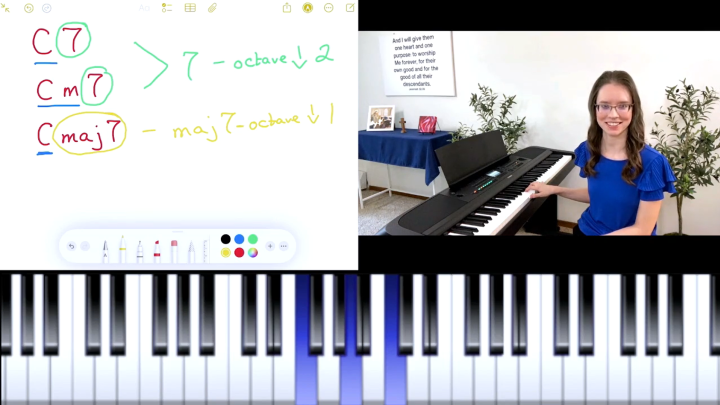 When you sign up for online lessons with me, you can expect quality instruction, including high-quality video and audio. I use clear camera angles, a diagram to show you the exact keys I am playing, and a special program that allows me to show you my iPad screen as I write comments on your music. Online lessons allow you to learn from the comfort of your own home, at your own instrument, on your own time. Sign up today!