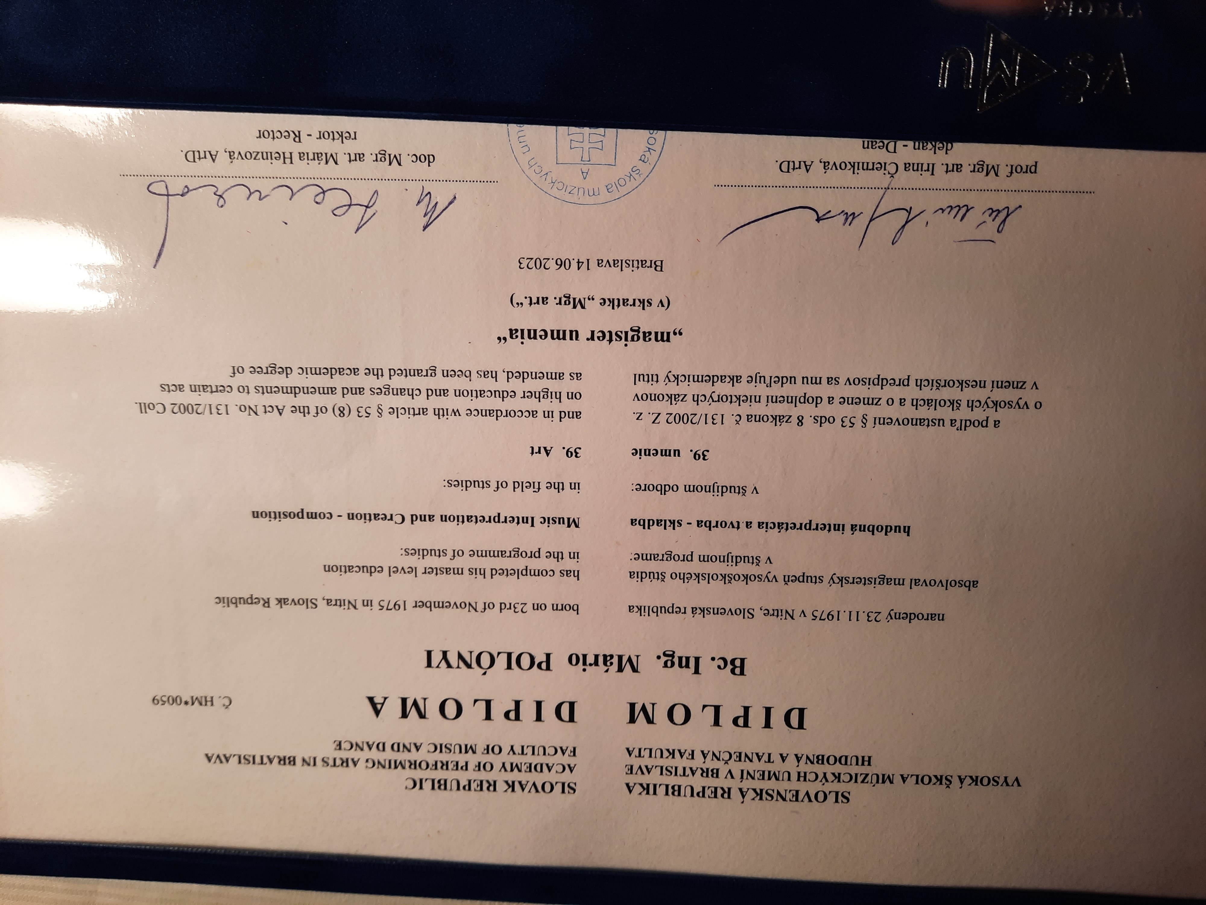 I completed my bachelor bass guitar studies at Ján Albrecht music and art academy Banská Štiavnica in 2016 and my master degree composition studies at the University of Performing Arts in Bratislava in 2023. Between 2001 and 2006 I was working as a guitar and bass guitar teacher for Musicana, a private musical academy in Bratislava. In 2016 and 2017 I was working as a bass guitar teacher in the Private Conservatory of Dezider Kardoš in Topoľčany, Slovakia. Since 2024, I've bee working as a guitar teacher in Art Pegas, en elementary music school in Bratislava. During all these years, I was also giving private music lessons.