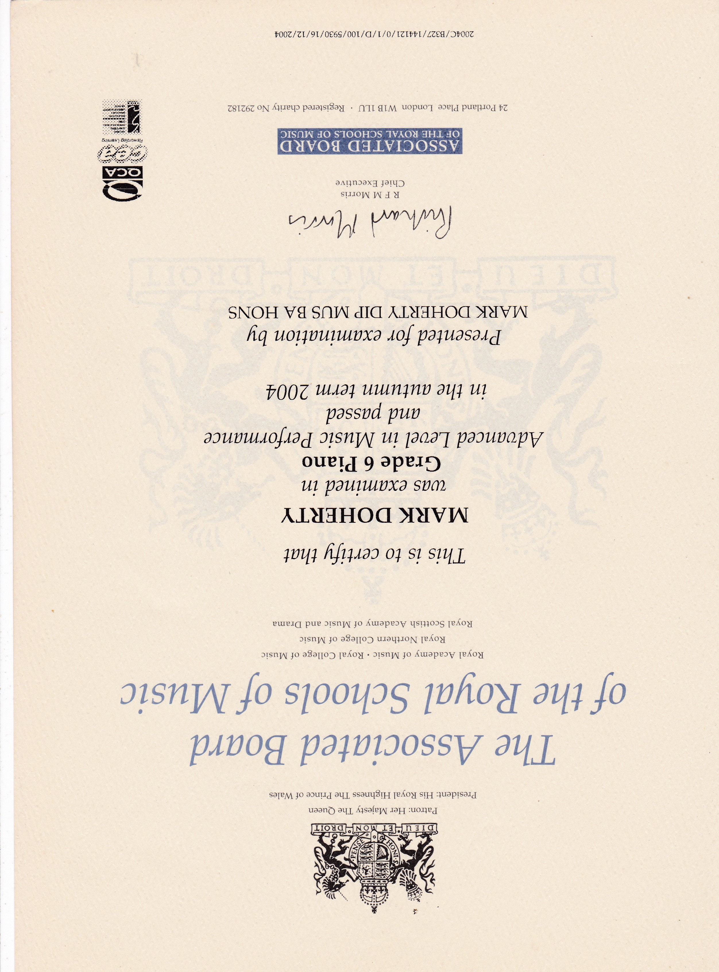 Diploma in Music and History Awarded December 1999 by The Open University UK.
