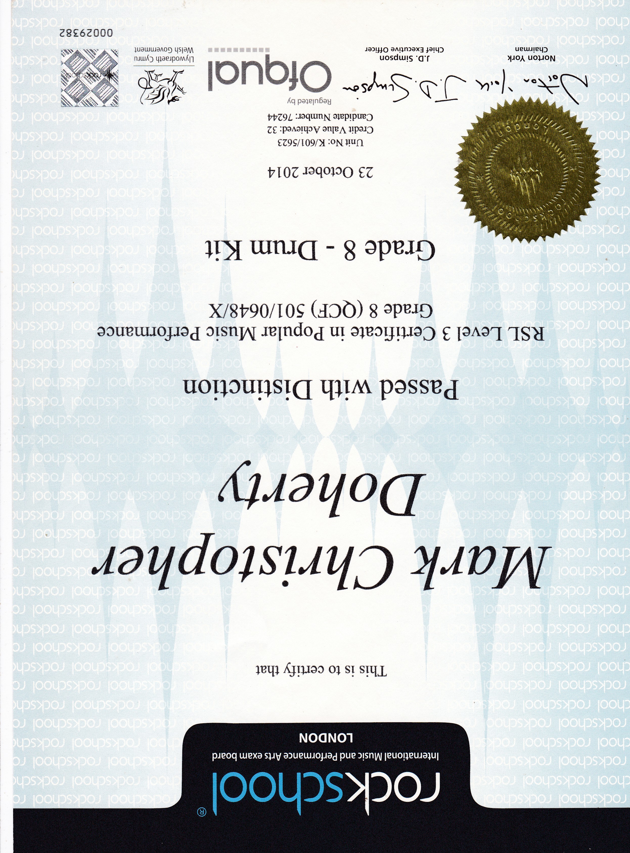 RSL Grade 8 Drums Performance and Grade 8 Drum Kit  Certificate obtained 2012 - 2014.