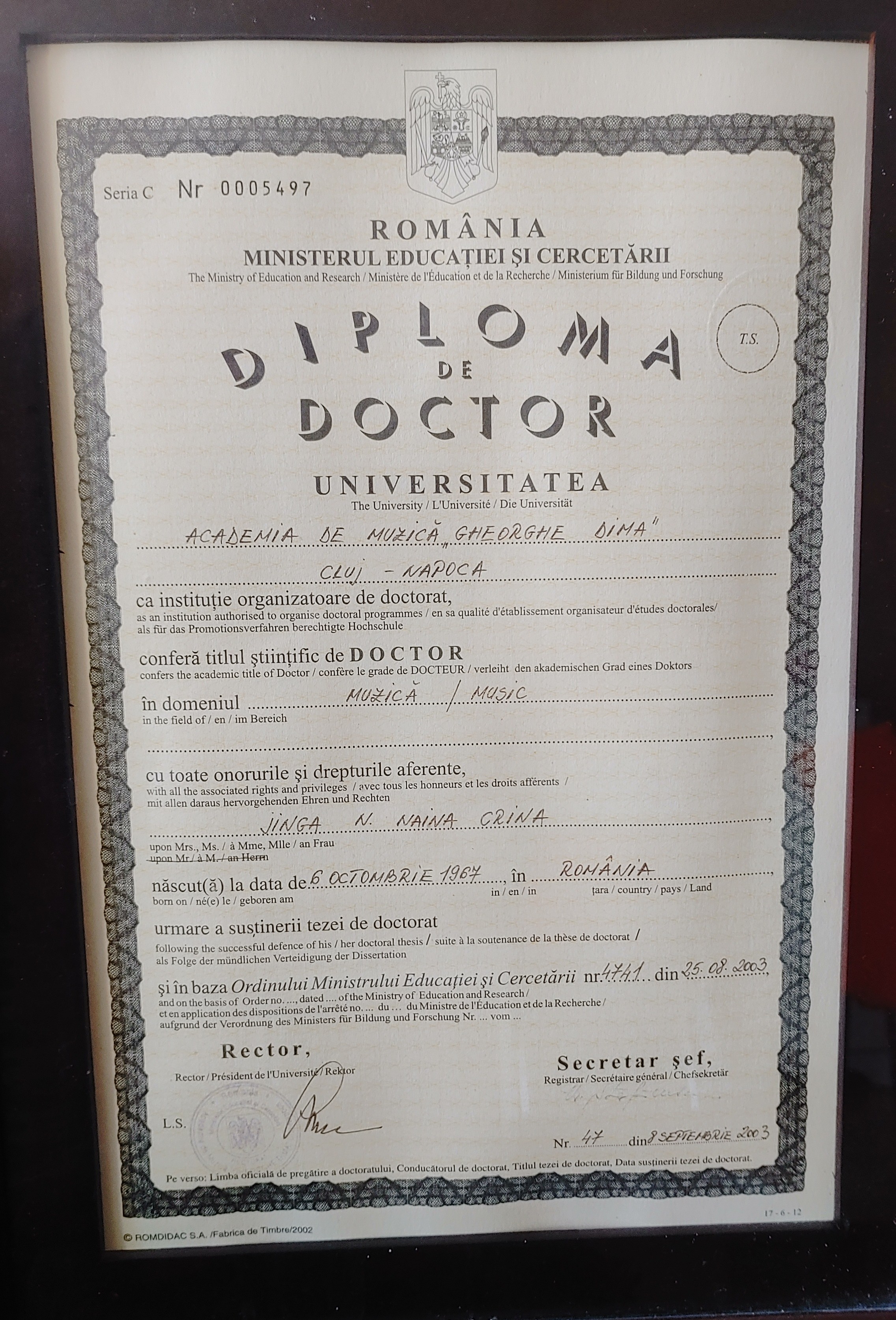 I graduated from the "Gheorghe Dima" Academy of Music in 1991 (B.Mus), where I was later appointed as an Assistant Professor and, in 1998, as a University lecturer. I also hold a Master in Music (2005 from the University of Western Ontario, London, ON) and a Ph.D. in Composition with a “Magna cum Laudae” (from the "Gheorghe Dima" Academy of Music, Cluj-Napoca, Romania).