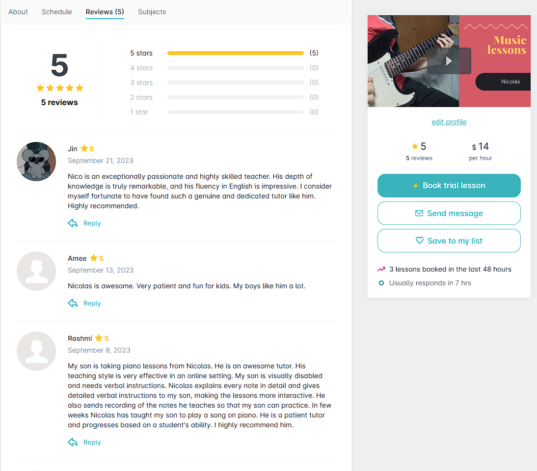 I teach guitar and piano, blending traditional training with pop music. I’ve tailored lessons to student interests, including custom transcriptions, both in-person and online.