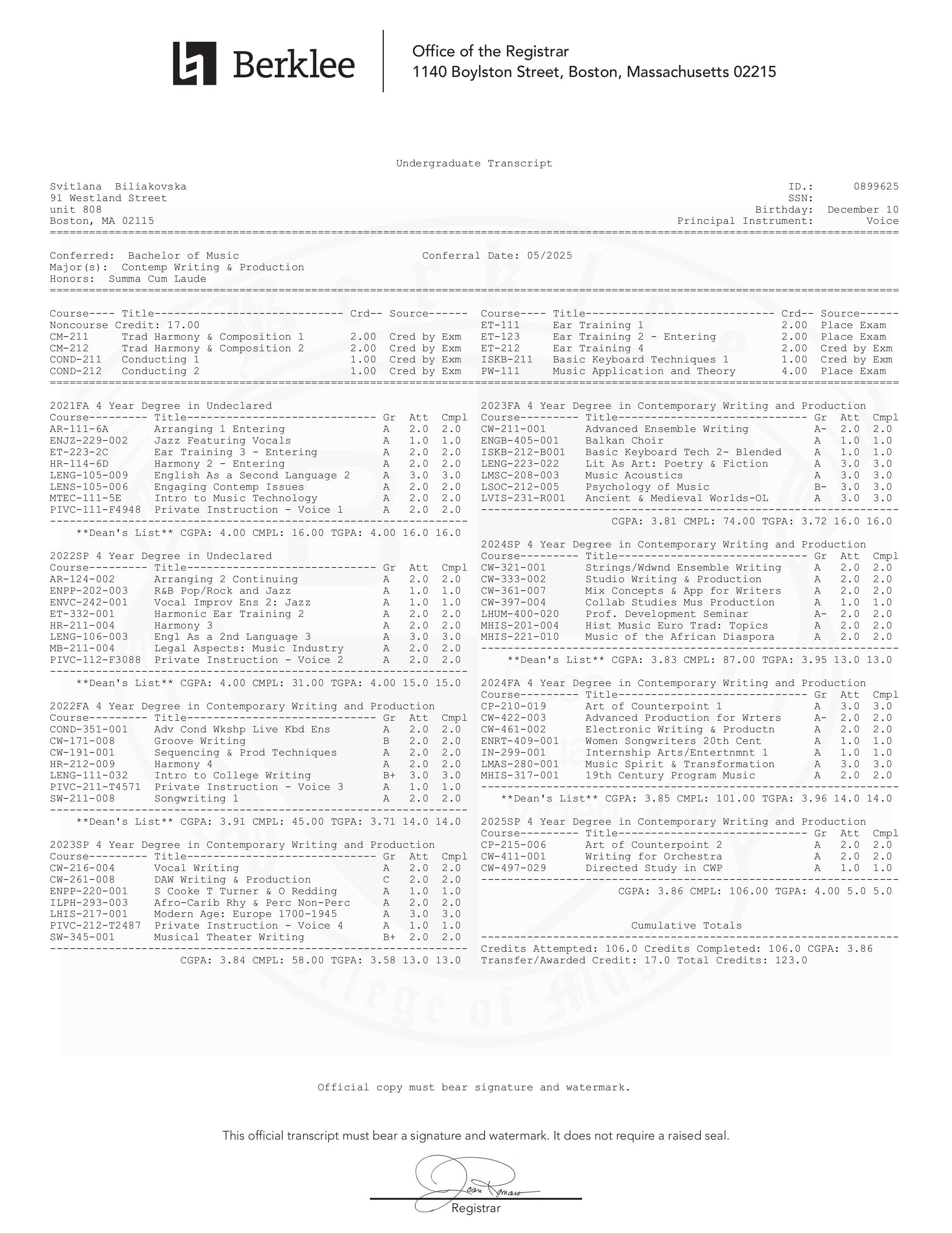 I am a Berklee College of Music graduate (2021–2025), holding a Bachelor of Music in Contemporary Writing and Production, awarded summa cum laude with a full-tuition scholarship. Prior to Berklee, I earned a Junior Specialist Diploma with honors in Choir Conducting from Stanislav Liudkevych Music College in Lviv, Ukraine.