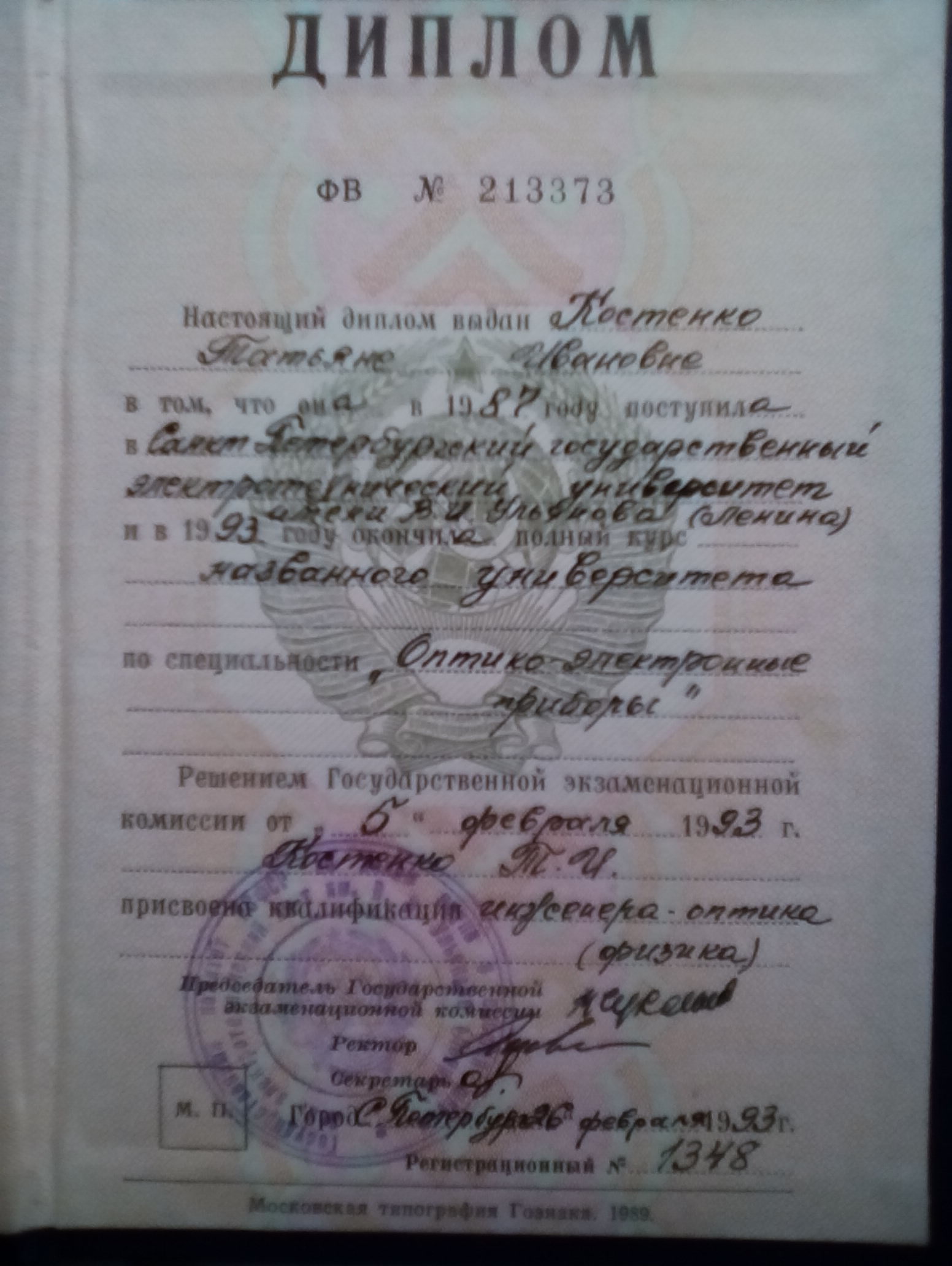 Saint Petersburg Electrotechnical University "LETI" named after V.I. Ulianov-Lenin (Bachelors degree obtained in 1993) "Leningrad State University named after A. S. Pushkin" Faculty of philosophy, cultural studies, and arts: department of music (Bachelors degree obtained on June 26th, 2020) "Saint-Petersburg College of Music pedagogy" (Bachelors Degree obtained in June of 2019) "Leningrad State University named after A. S. Pushkin" Faculty of philosophy, cultural studies, and arts: department of music (Master’s degree program started in September of 2020, will obtain degree in June of 2022)