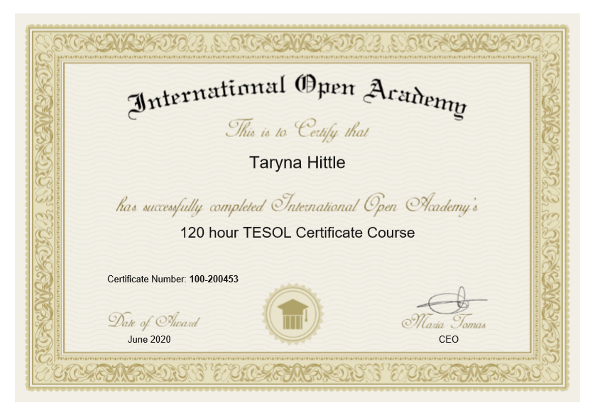 Kansas State Teaching License in Elementary Education (K-6), Kansas State ESOL Endorsement, 120 hour TESOL Certificate, 120 hour TEFL Certificate