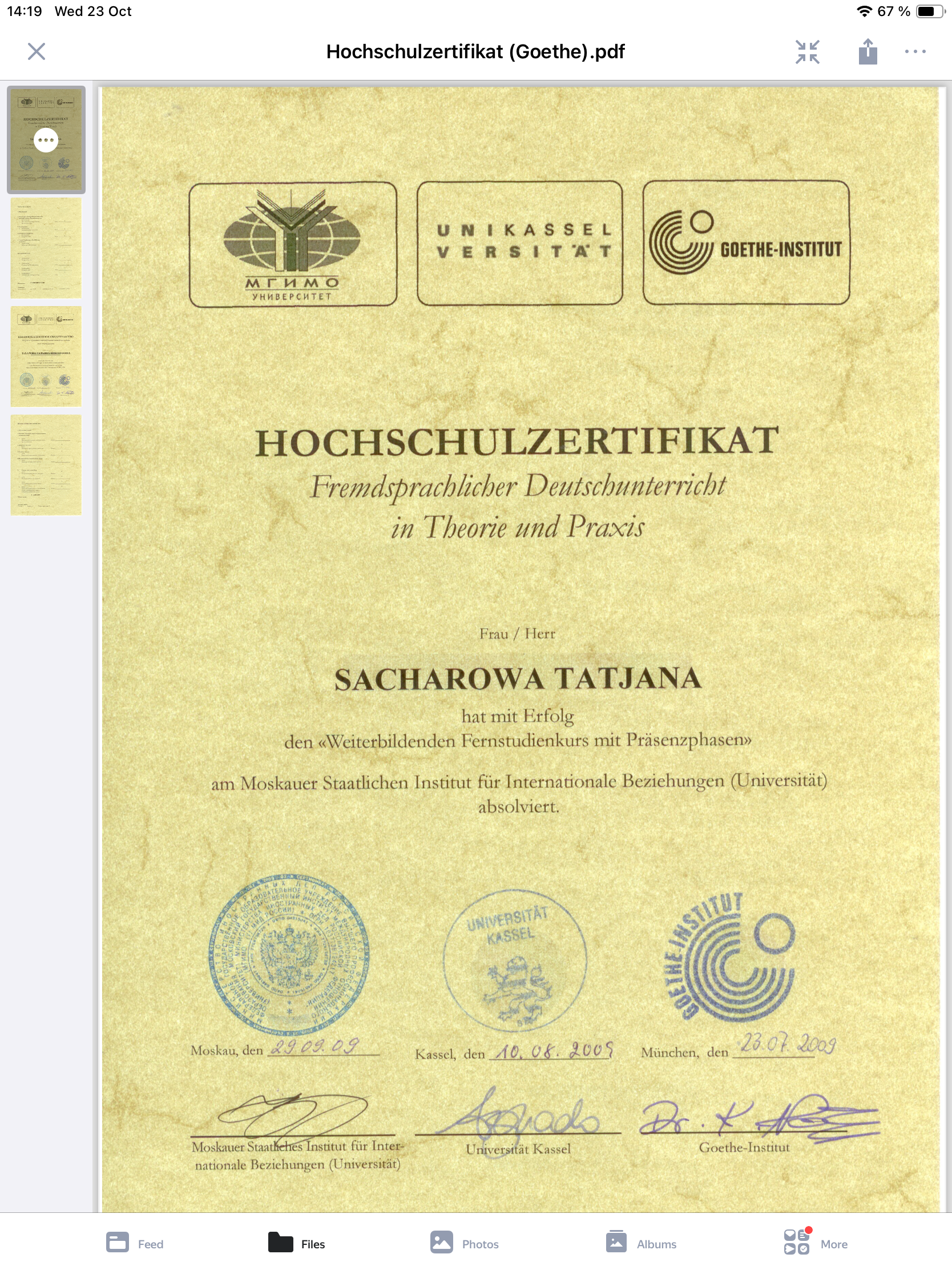I obtained my Master’s degree in Education (German language), Ph.D in Germanic languages at Moscow State Linguistic University and Teaching Certificate (German as a Foreign Language) at Goethe-Institute (Munich).