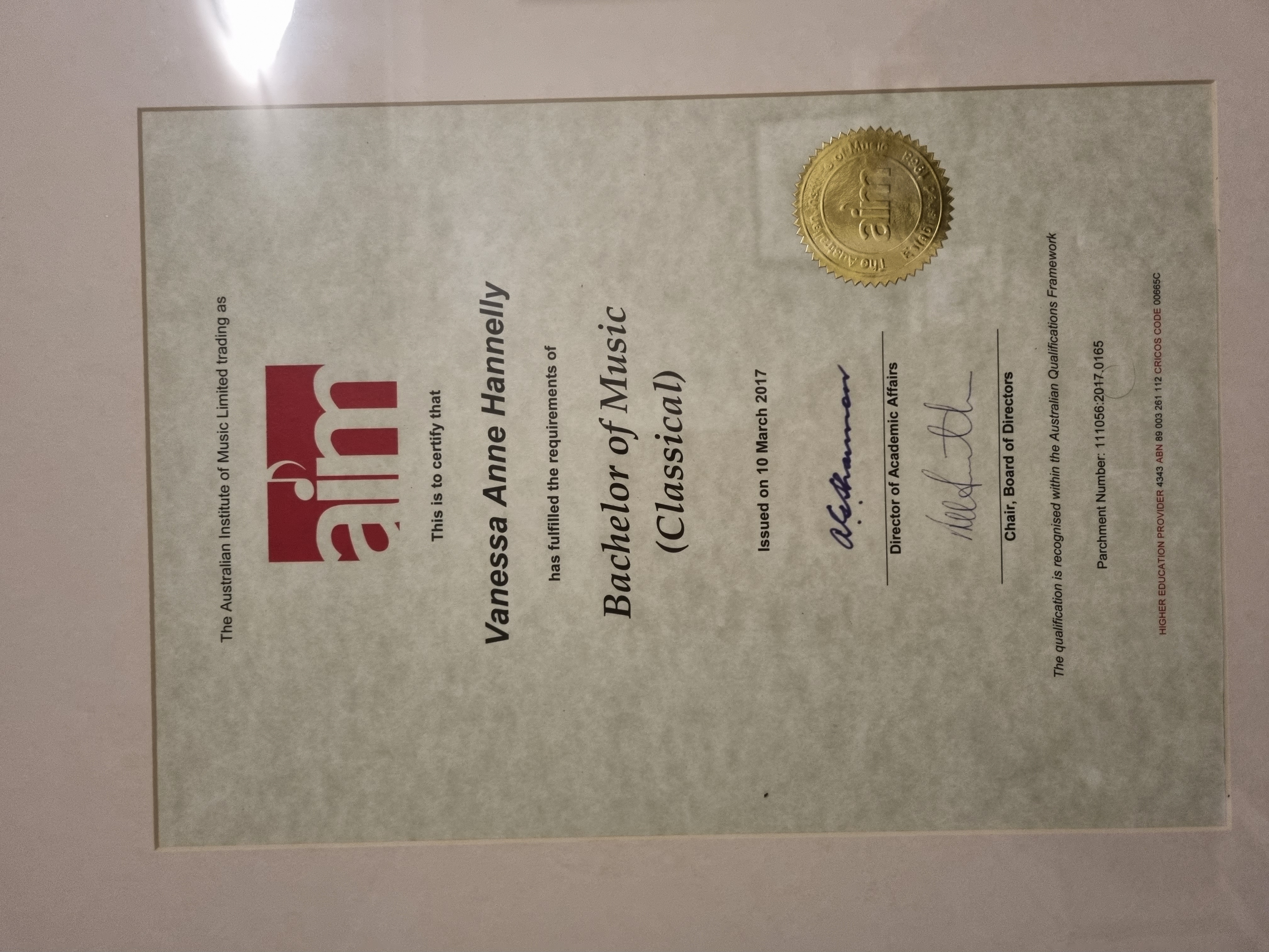 I hold a Bachelor of Music majoring in Classical performance from the Australian Institute of Music which I received in March 2017.