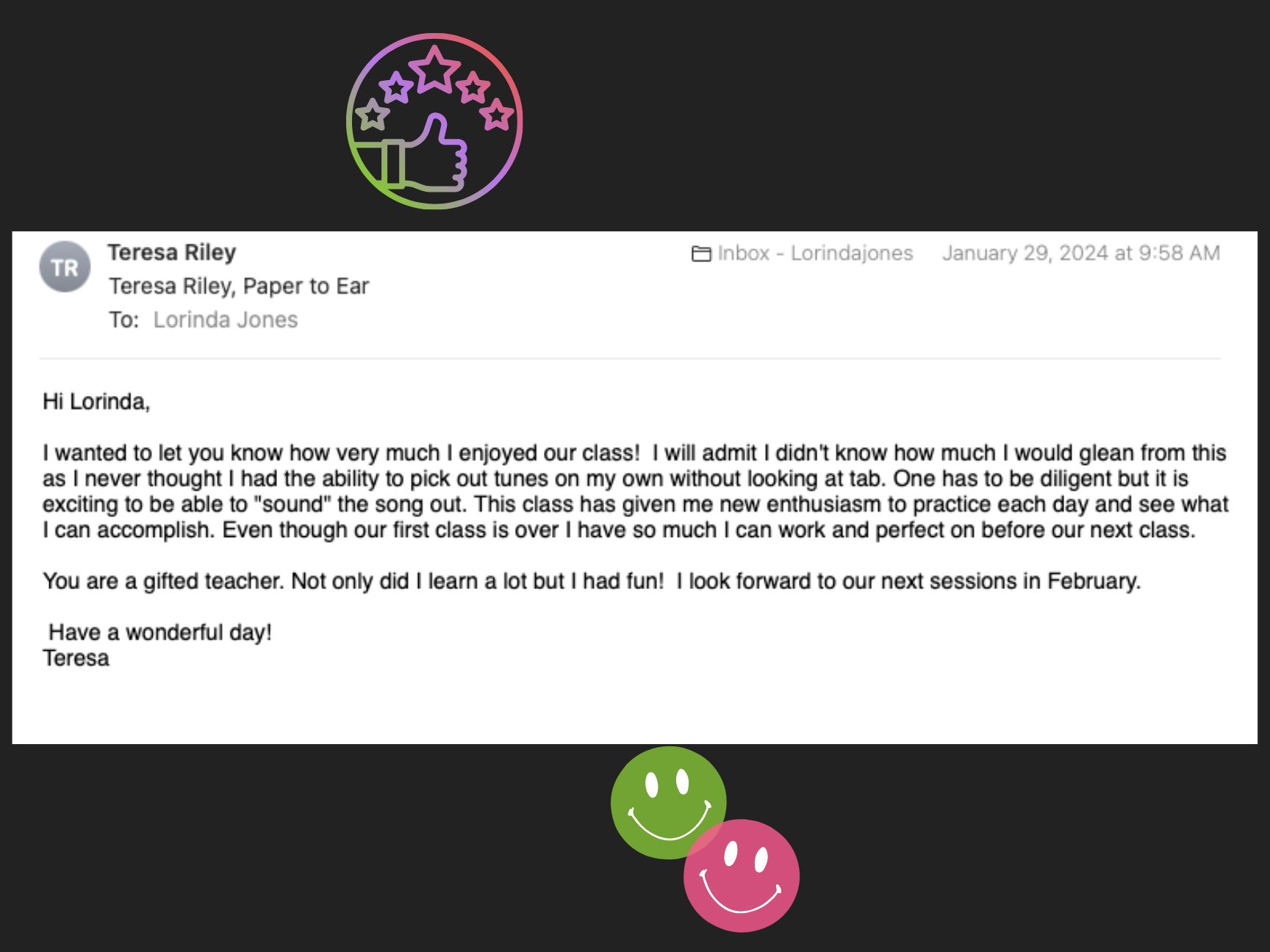 I really appreciated the lessons which were gently and systematically presented. I was able to use the principles in the lessons to play an old hymn tune by ear. That is a big new step for me. Thank you. Kathy F.
